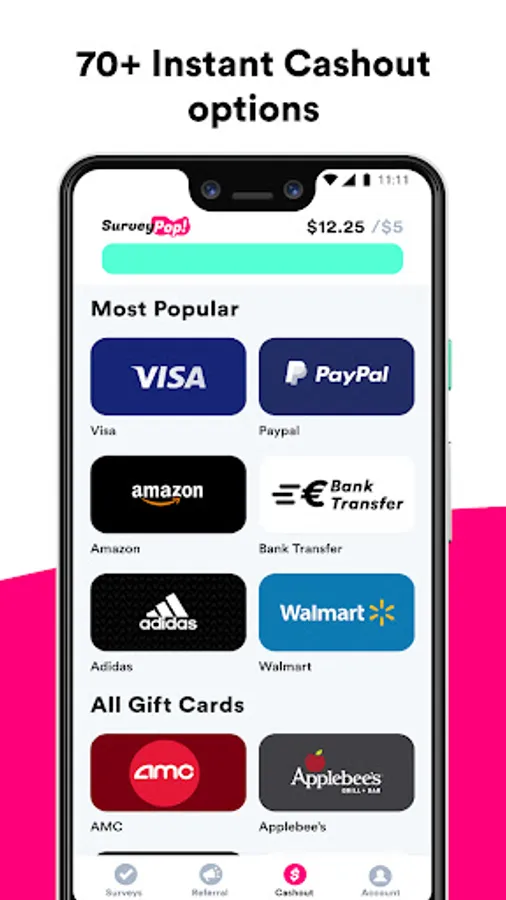 We offer instant cashouts to PayPal and 70+ gift cards. Our gift card rewards include Amazon Gift Cards, Visa, and Walmart.