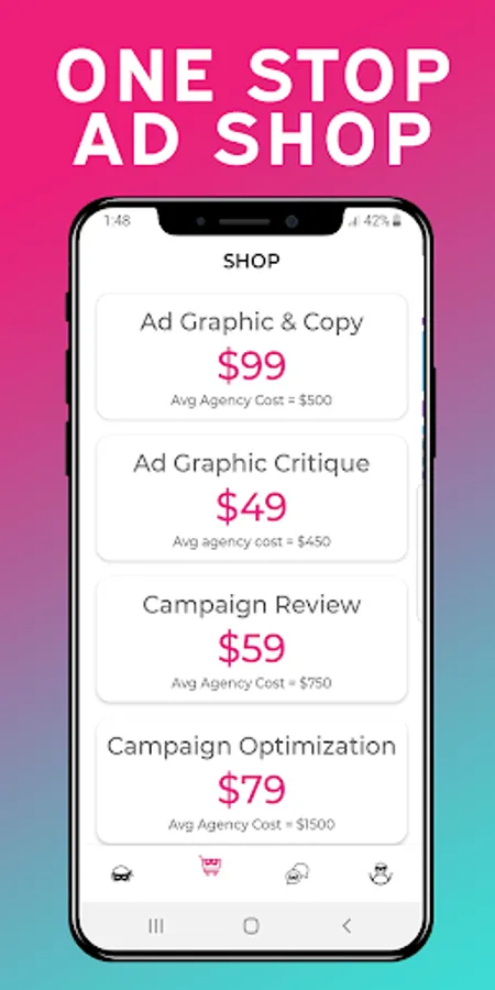 Get professional help for affordable pricing. From ad graphic critiques to ad graphic creation. From campaign reviews to scaling your campaigns for you. From lead generation to sales campaigns. Now you've got the power of a digital marketing agency in your pocket. Nothing can stop you!