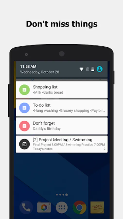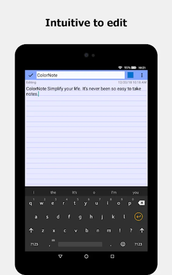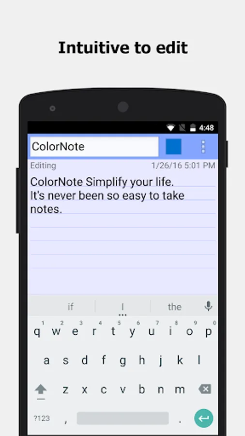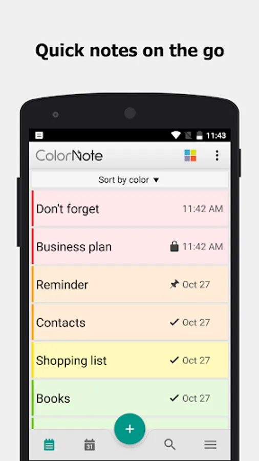 ColorNote® is a simple and awesome notepad app. It gives you a quick and simple notepad editing experience when you write notes, memos, e-mails, messages, shopping lists and to-do lists. Taking notes with ColorNote® Notepad is easier than any other notepad or memo pad app.