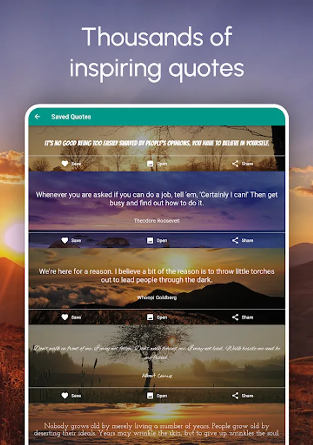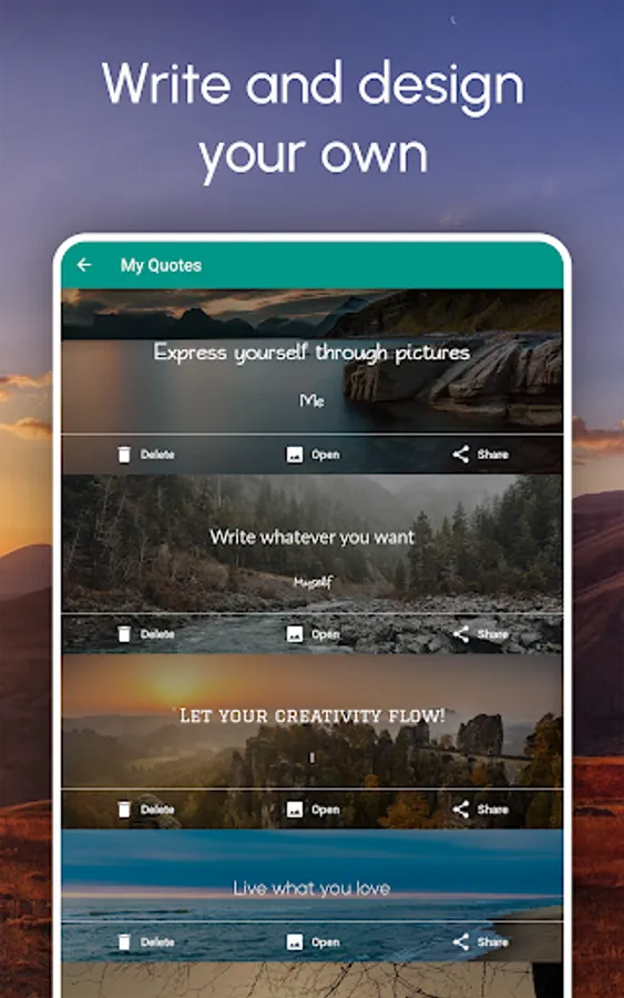 Add text to photos to create your own positive quote of the day. You can also download the image directly to your image gallery if you'd like to keep a copy. If you make quotes yourself, they are also saved.