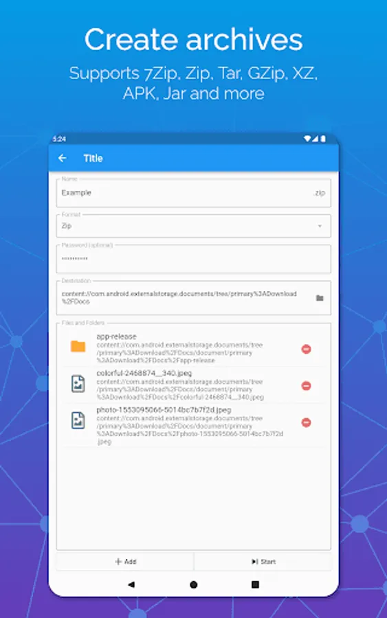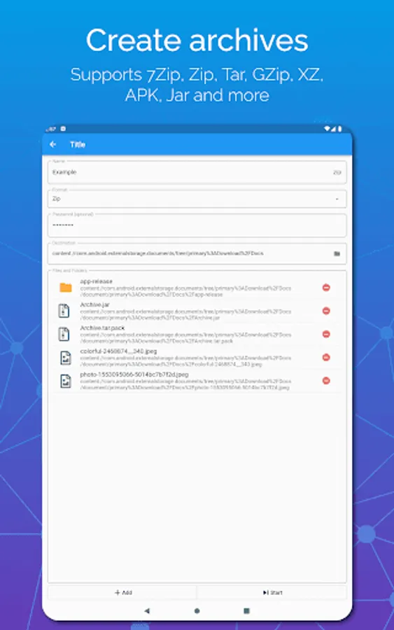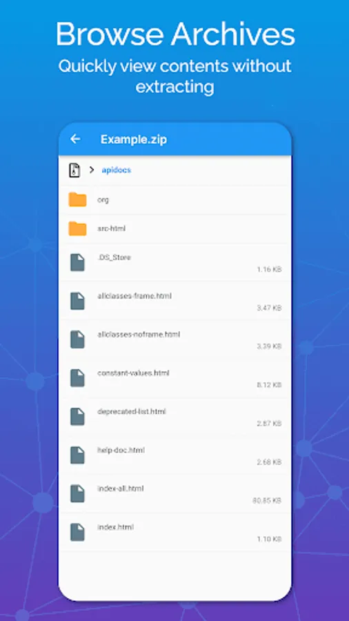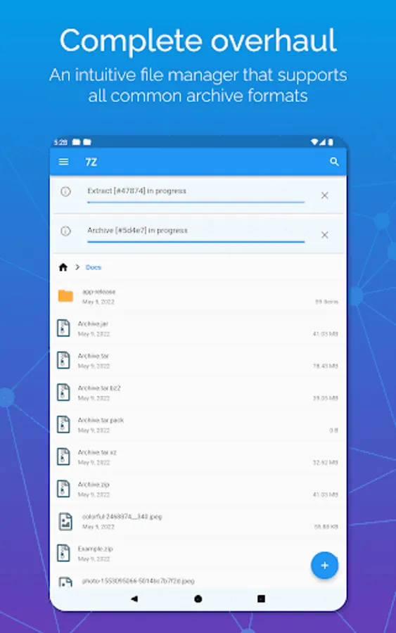 ✔ Supports all common archive formats and types (zip, rar, 7zip, 7z, jar, apk, tar, gzip)