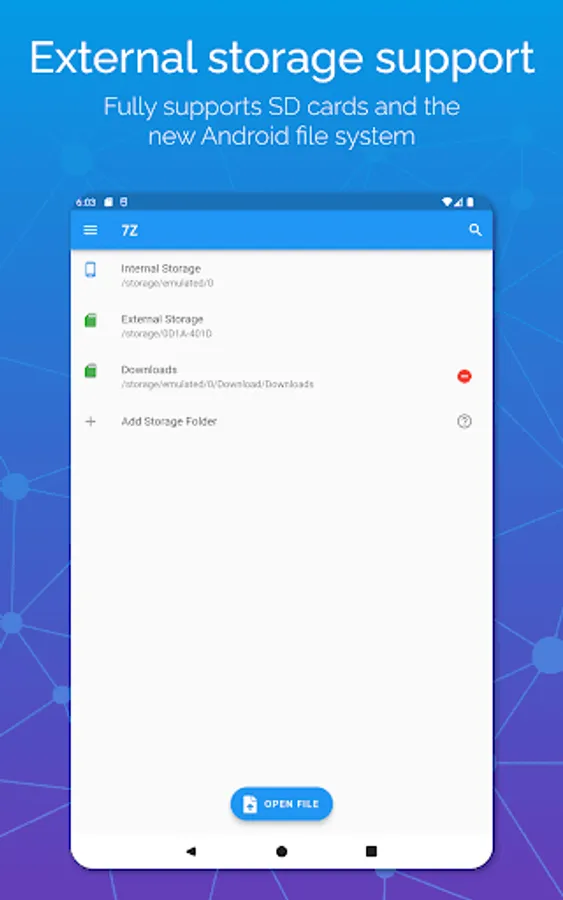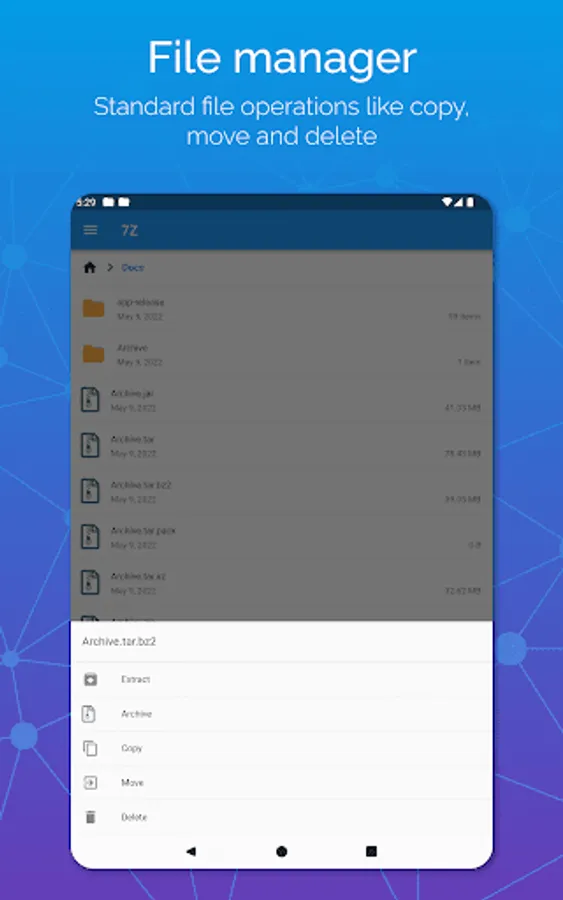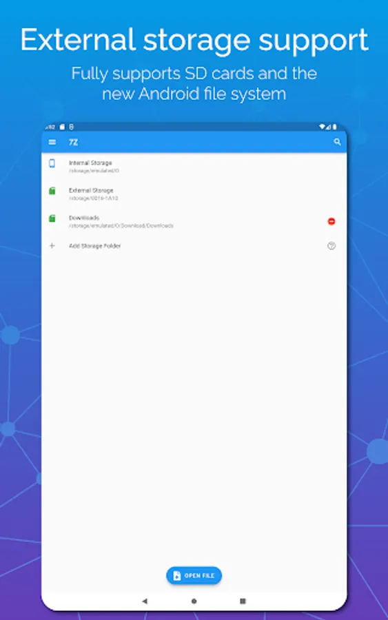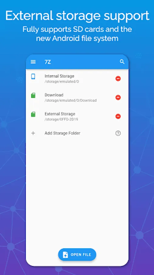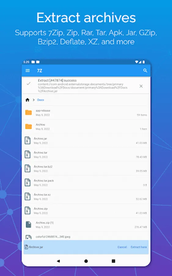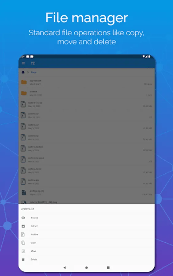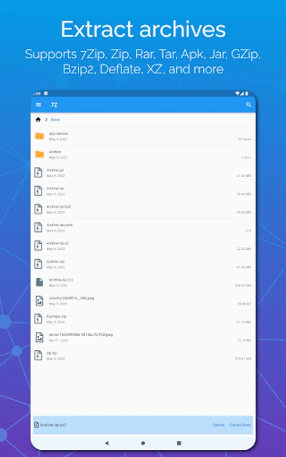 7Z lets you take control of archive files like 7Zip (7z format) zip, rar, jar or APK on your device. Quickly and easily extract, open, view or create your own archive by compressing files and folders.