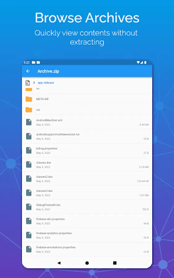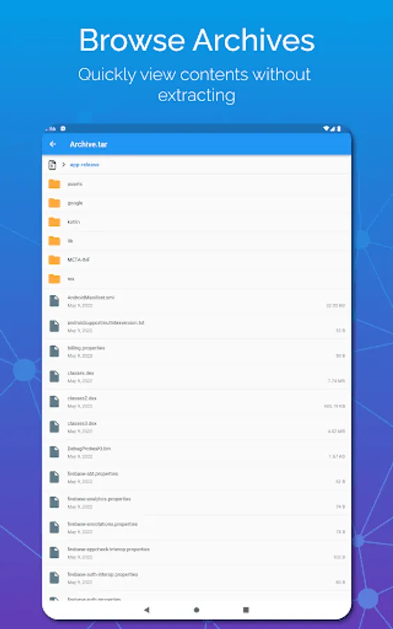 ✔ Browse the contents of archive formats that contain multiple files: 7Zip, 7z, Tar, Apk, Jar, Rar