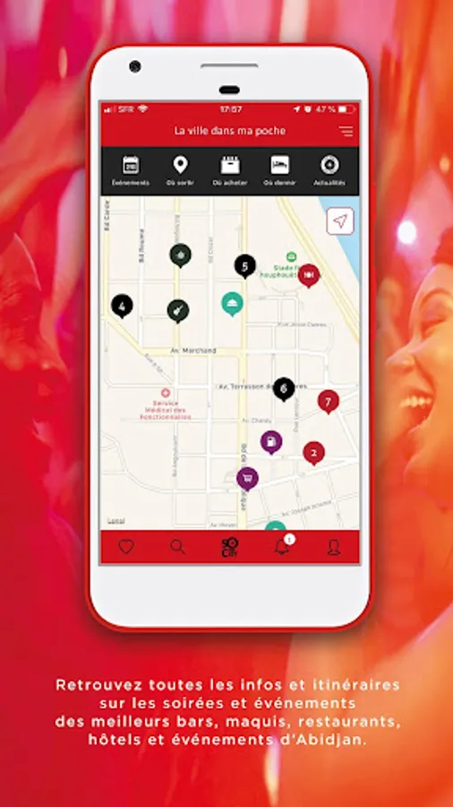 Thus the purpose of this application is to allow Abidjan and tourists to search and find the best places for their trips to Abidjan: Good addresses, maquis or bars of the moment, events and parties trendy ...