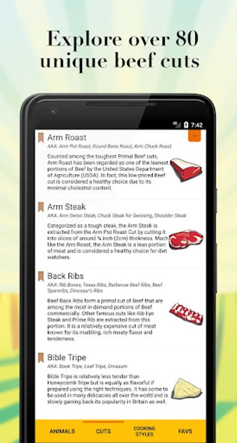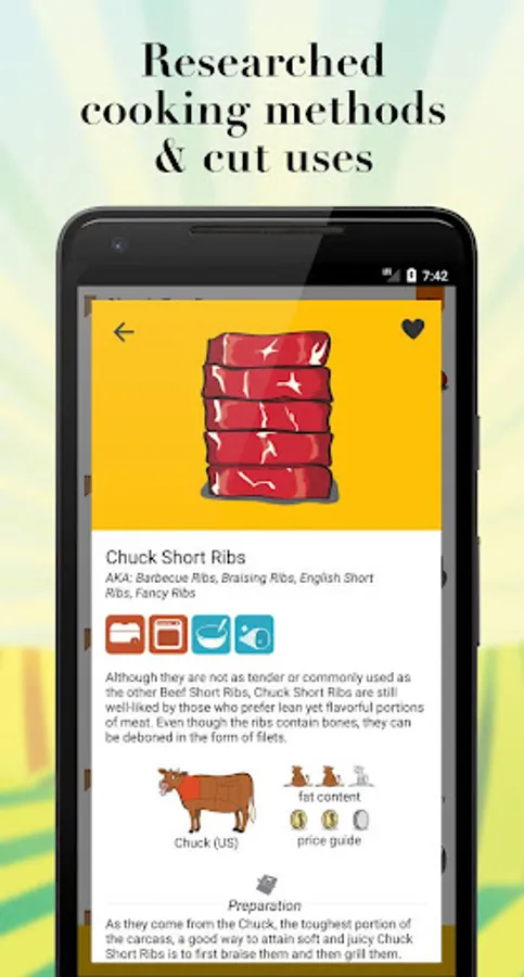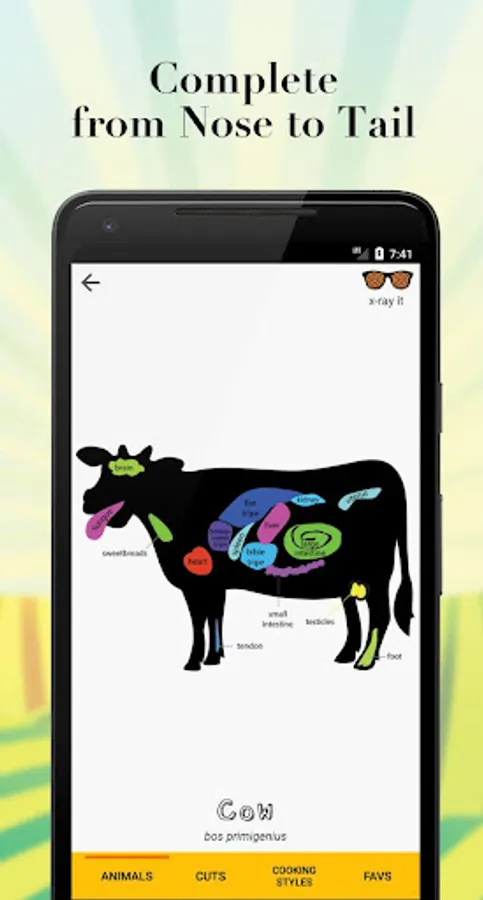 Ultimate cooking app to discover where your meat comes from. Our meat cut app contains recipes, best preparation methods, pictures, fat content and interesting meat facts. Explore each animal using our butcher's diagram or use our X-ray feature to find even more interesting cuts.