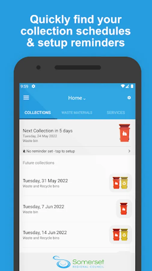 Never miss your bin day again with the new Somerset Bin App (Queensland, Australia). Find out when your rubbish bin gets collected and if it's recycling week. The app has some great features for residents including bin day reminders, waste sorting tips and provides important information on other events and services coming up in your area.