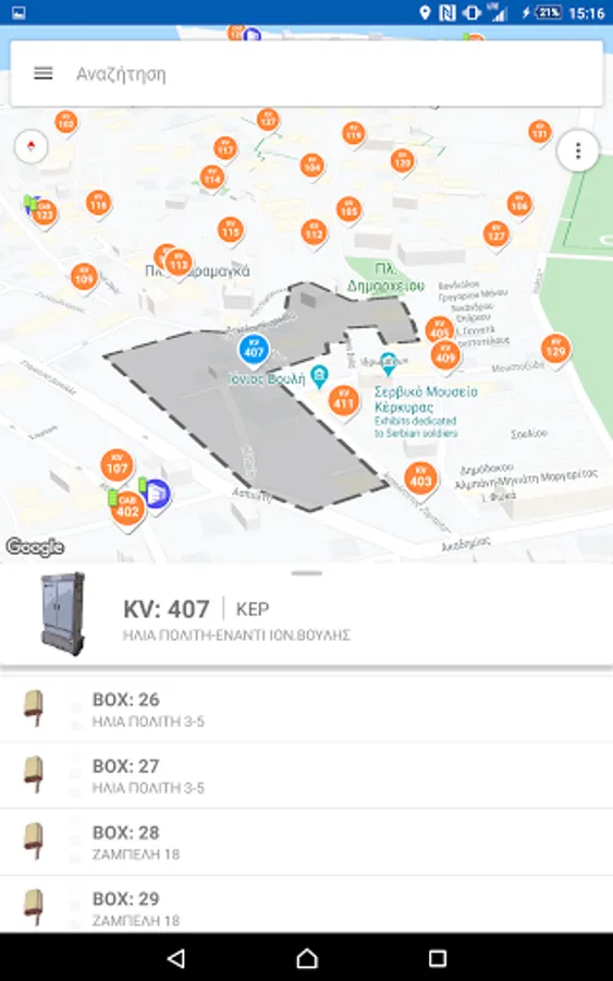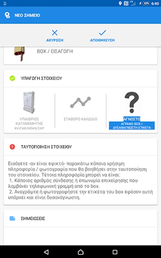 MyField provides advanced search / display / navigation capabilities for OTE network data. In addition, it enables the entry of new elements (box, inputs, connectors of copper and fiber optic cables) as well as the possibility of entering notes and photos in any network element but also freely on the map. The data entered are automatically distributed to all technical-users of the application within the same Technical Department.