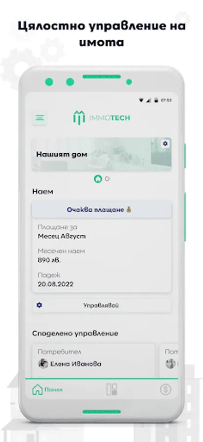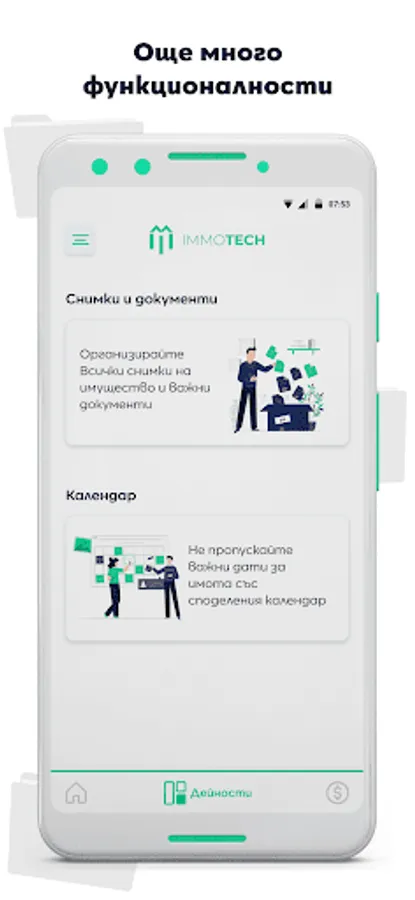 Immotech е абсолютно всичко за едно домакинство по дигитален път - плащане на сметки; следене на разходи; комуникация със съседи; търсене на услуги; складиране по папки на снимки, файлове и документи; споделяне на важни дати в общ календар. Immotech е мобилното супер-приложение с огромен набор от функционалности, така че всеки живущ да има поне едно нещо, за което Immotech да е полезен в неговия имот и домакинство.