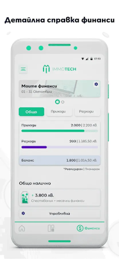 Приложението следи всички приходи и разходи за имота и на база автоматични, в реално време генериращи се анализи дава ценни съвети за оптимизиране на парите в домакинството. Човек първоначално преминава през бърза настройка на своите лични финанси - очаквани приходи и разходи за един календарен месец, подредени по пера и категории. Всяка една реално случила се транзакция бива отчетена в Immotech или ръчно от потребителя с два клика, или изцяло автоматично на база синхронизиране на банковата сметка на потребителя с приложението (възползвайки се от общоприетия от всички банки в ЕС протокол за Open Banking / PSD2). Така се постига максимална прозрачност колко за какво от кого се харчи в домакинството и спомага за сформиране на добри навици за ефективен семеен бюджет.