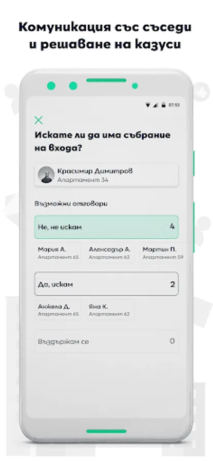 Отделен голям модул “Съседи” дава на потребителите в Immotech необходимото решение. В началото има избор за присъединяване към съществуваща съседска общност или създаване на нова такава със съседите във входа, кооперацията или съседните къщи. От там започва управлението на отношенията: дигитално табло, заменящо лепенето на хартийки по врати, входове и стълбове; споделен календар за всички важни дати и събития за съседската общност; гласувания по теми с ясен преглед кой за какво е дал своето предпочитание; и може би най-улесняващата ежедневието функционалност - иницийране на събиране на пари, директното им заплащане чрез платформата и проследяване кой кога колко е платил или съответно е останал длъжник. Така Immotech се превръща в пълноценната микро социална платформа за управление на собствения имот и домакинство.