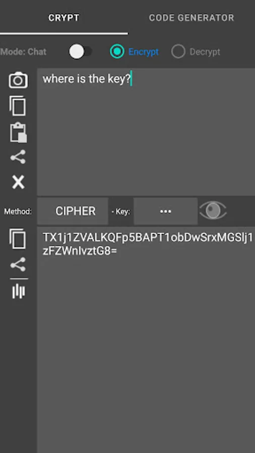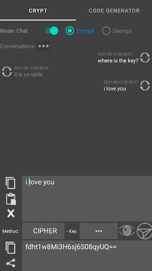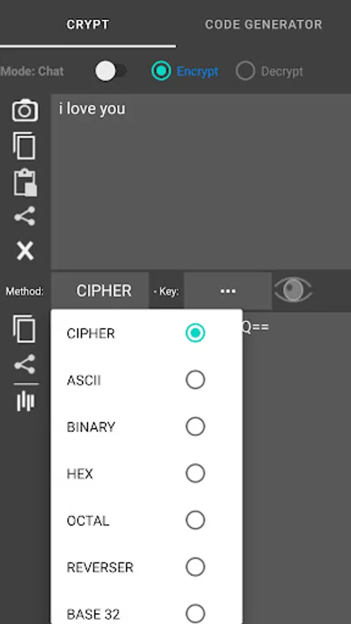 The app encrypts and decrypts your text in several different encryptions. The app when encrypting / decrypting the text you have the option to replace the current text (if you selected it), copy or share the encrypted / decrypted text.