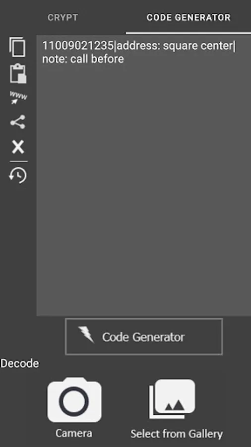 Scan and generate code : QR Code, Barcode, Code 39, Code 128, DataMatrix,... and support convert text to rows wizard, delimiters: |,#,; You can encrypts text before generate code