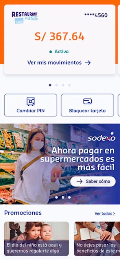 Realiza tus operaciones desde donde estés con el app Sodexo Club Perú. - Consulta el saldo disponible en tu tarjeta. - Revisa los movimientos de tus compras. - Cambia la clave pin de tu tarjeta. - Bloquea y tramita una nueva tarjeta Sodexo. - Accede a promociones exclusivas de Sodexo. - Conoce todos los comercios donde usar tu tarjeta a nivel nacional. - Contáctate con nosotros. Estas y muchas más funcionalidades exclusivas para ti.
