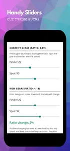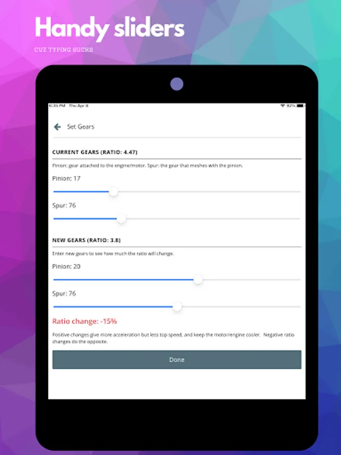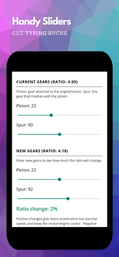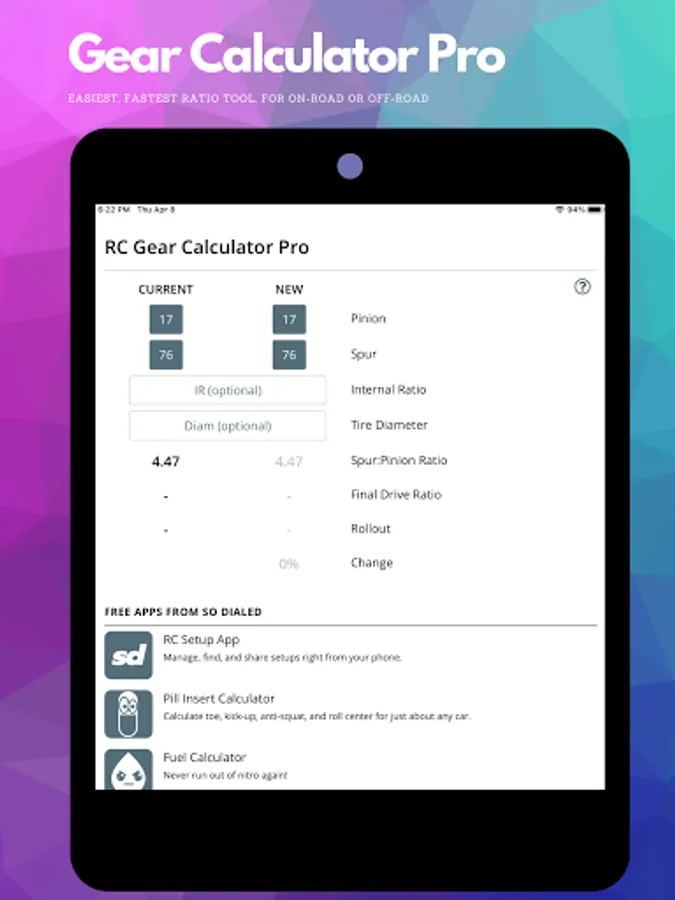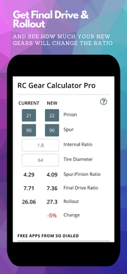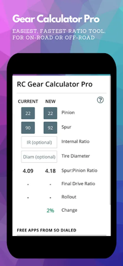 Easily calculate your gear ratio, and to really understand the effect of your change enter your "before and after" gears and see what percentage change it will produce, so you'll know how much the new gear ratio will change your speed and acceleration and how much load it will put on the motor. Great for all types of RC racing and bashing.