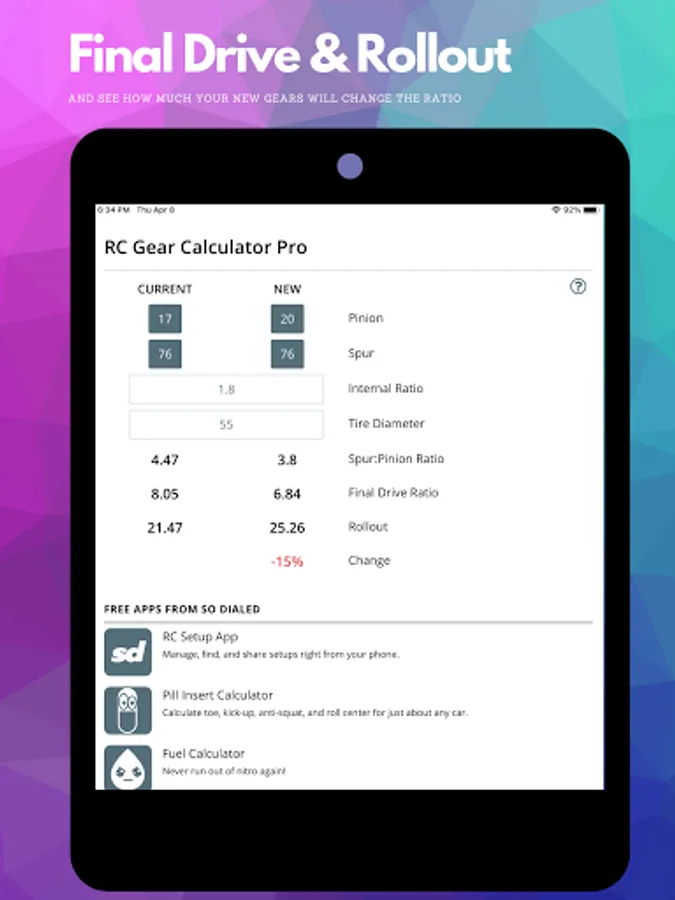 Aside from the primary ratio (spur:pinion), you can also see your Final Drive Ratio (useful for all cars, but definitely for touring cars) and Rollout (useful for cars with foam tires.)