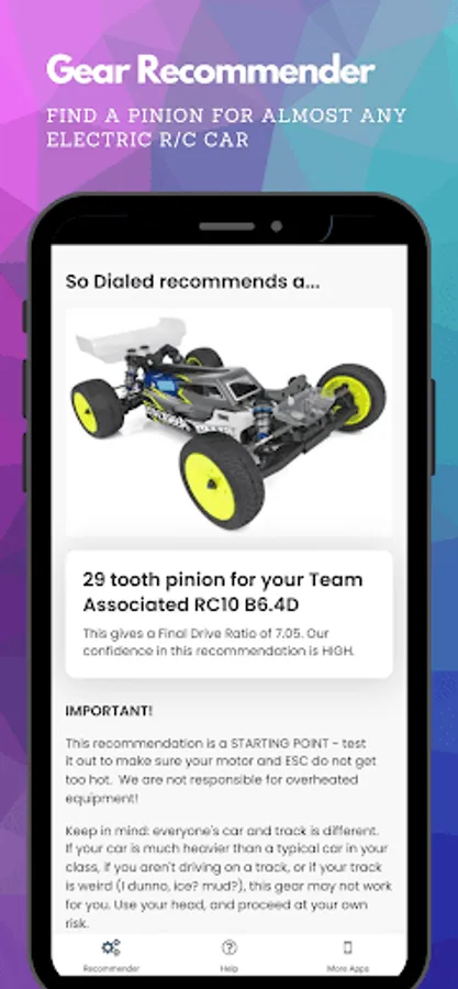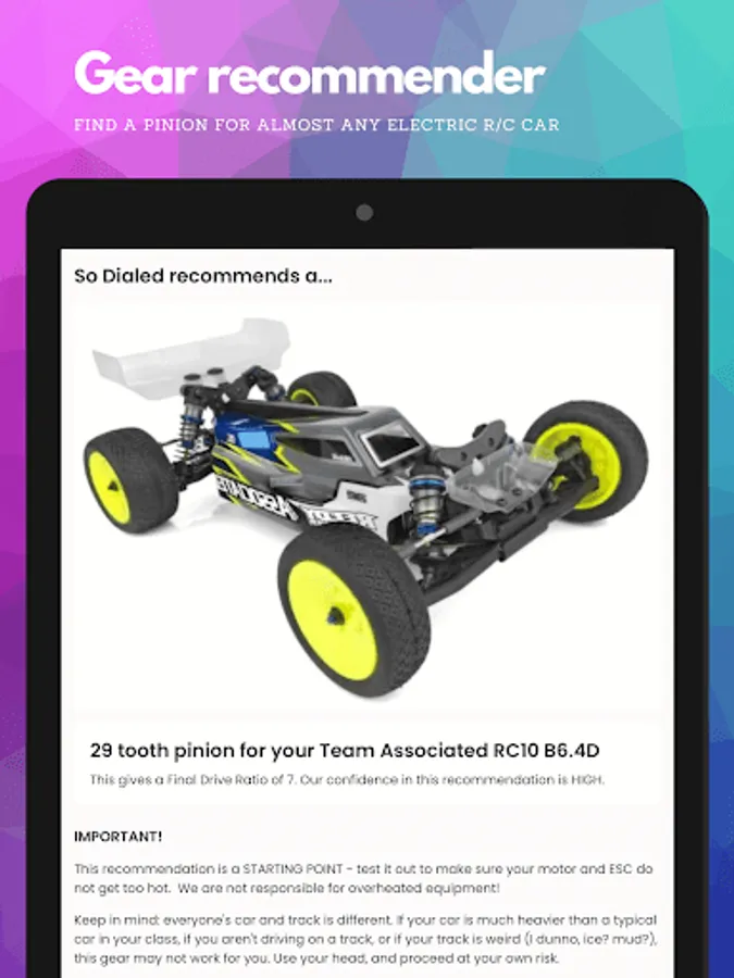 Also, our recommendations are a starting point, so after you try the pinion we suggest, please experiment to see what works best for your driving style and your track, and be sure to record your setups and races in our RC Setup App (link below.)