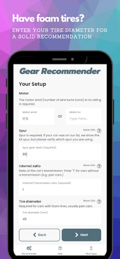 - Cars with foam tires work fine, too - just enter your tire diameter