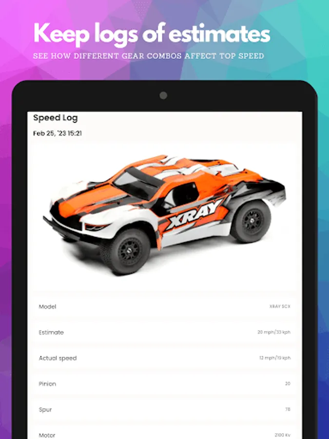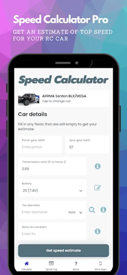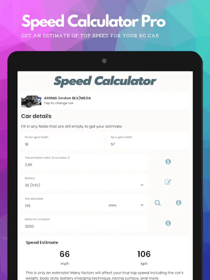 Quickly and easily get an estimate for your RC car's top speed with RC Speed Calculator Pro! Just tell us which car you have, enter some info about your gearing, motor and batteries, and we'll do the rest.