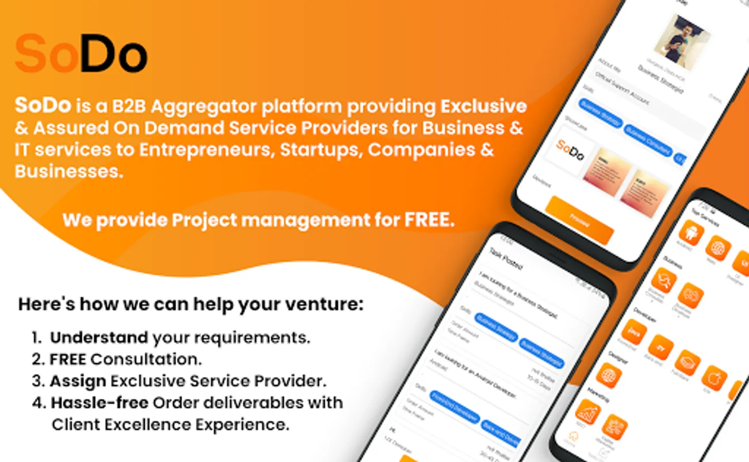 SoDo is a B2B Online Aggregator platform providing On Demand Exclusive Service Providers & Freelancers for Business & IT services to Entrepreneurs, Start-ups, Companies and Businesses with Project management for FREE.