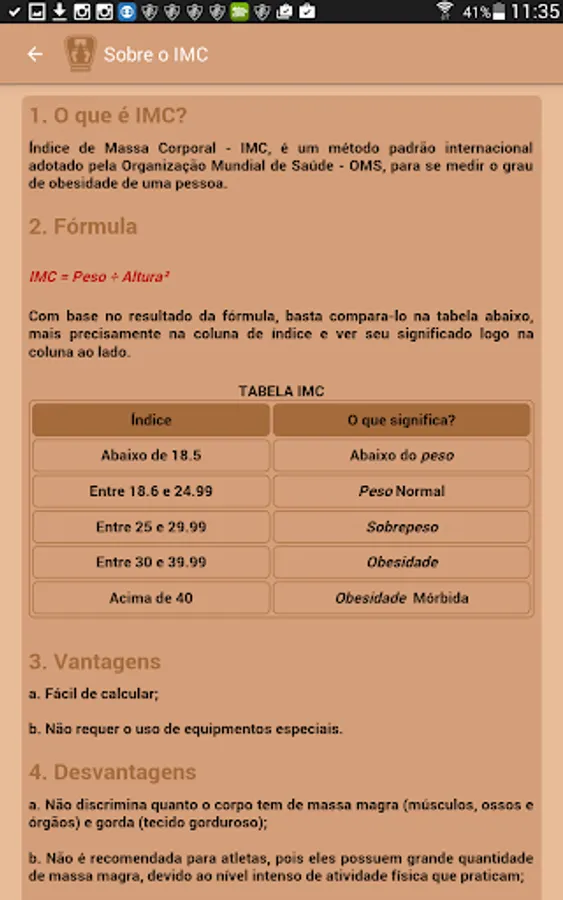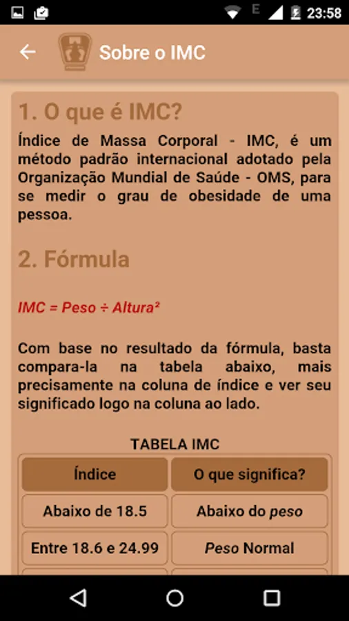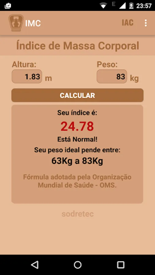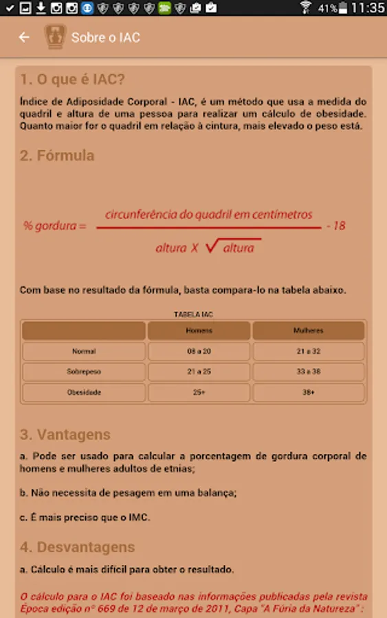 Note that the application NOT arrendonda the results both for BMI and for the IAC. Thus, it will be necessary to adjust the results of indices towards the evaluation tables can be found in the solution menu.