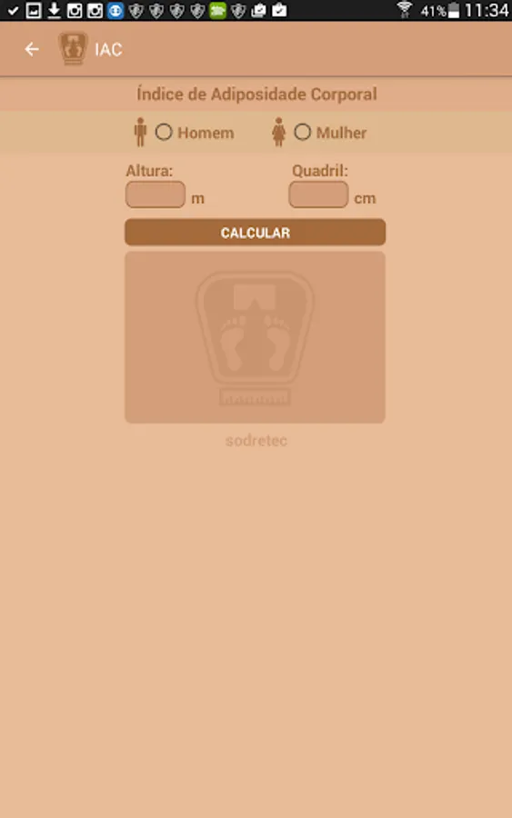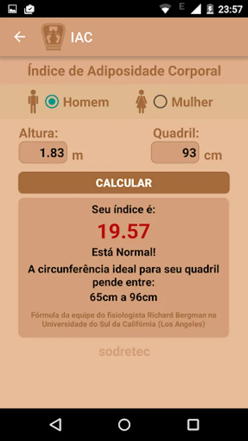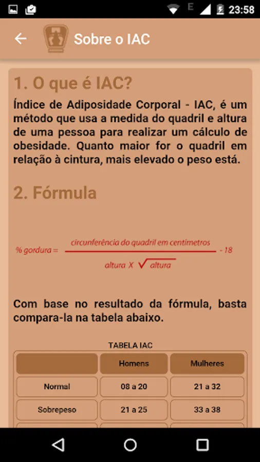 To be aware of your IAC, will require your height in meters and circumference of your hips in centimeters using a measuring tape. With the data obtained, pass them to the corresponding module and see its outcome.