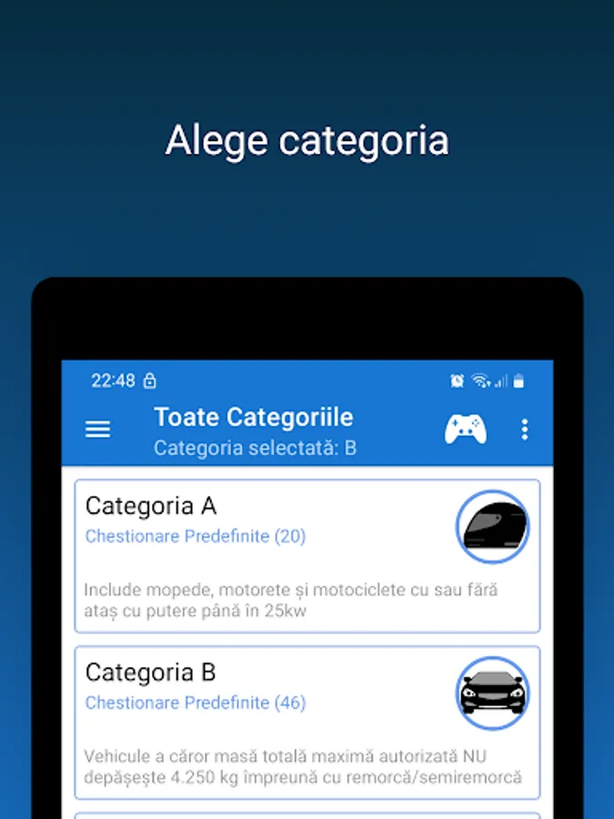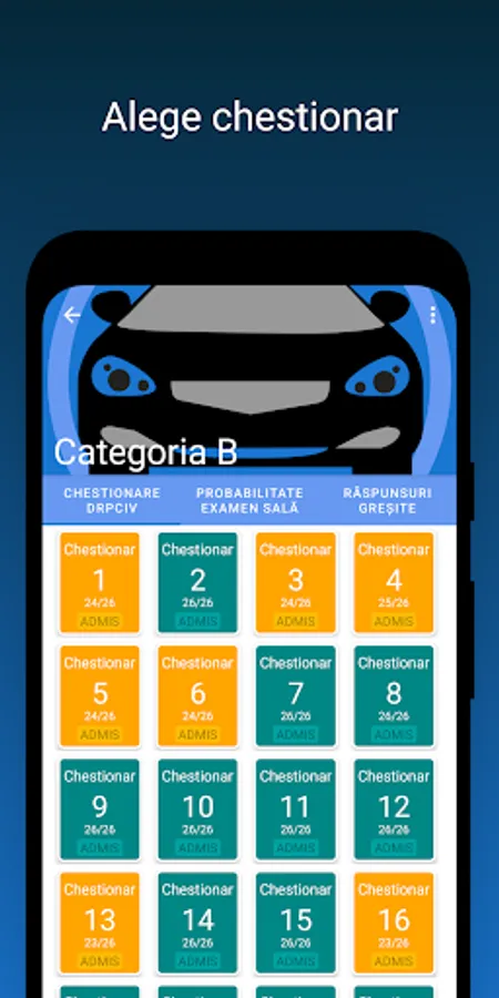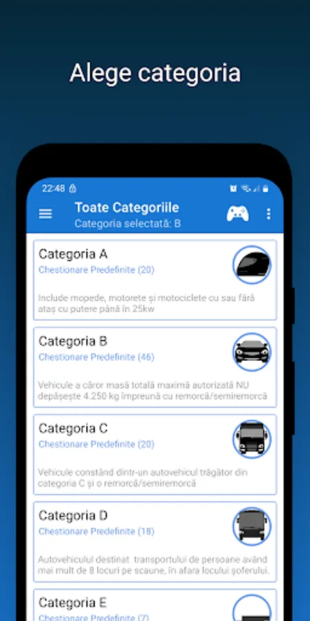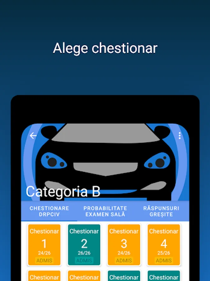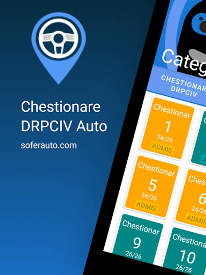 Sofer Auto Questionnaires DGPCI (formerly DRPCIV) is an application that contains the official questions from the driver's exam and is dedicated to students who enroll in the driving school offering the opportunity to learn by taking predefined auto quizzes with categories A, B, C, D, E learning environment or and reacquisition with learning environment and theory exam DGPCI (formerly DRPCIV). Car driver also offers the user to search for driving schools near him. More on the soferauto.com page