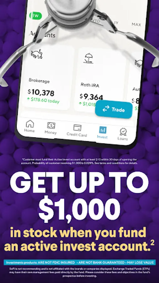 - Get up to $1000 of stock when you fund a SoFi Invest account.