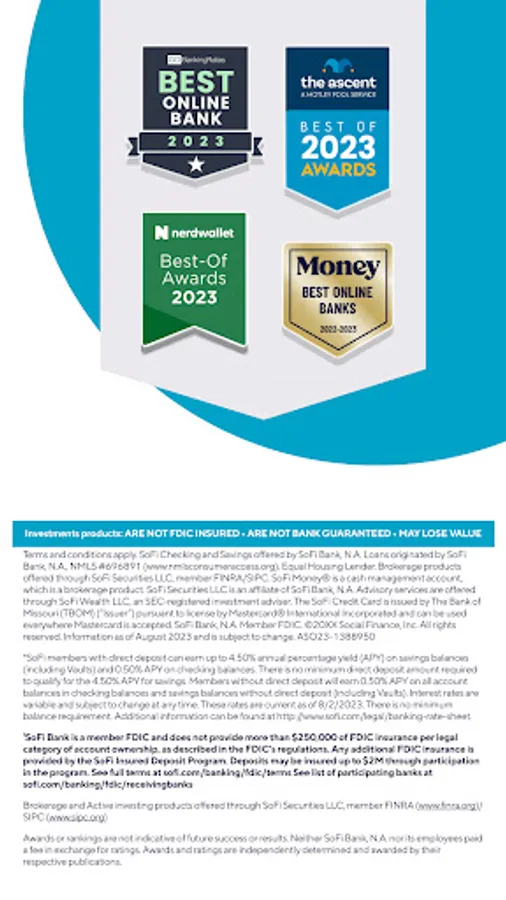 *SoFi members with direct deposit can earn up to 4.50% annual percentage yield (APY) on savings balances (including Vaults) and 0.50% APY on checking balances. There is no minimum direct deposit amount required to qualify for the 4.50% APY for savings. Members without direct deposit will earn up to 1.20% annual percentage yield (APY) on savings balances (including Vaults) and 0.50% APY on checking balances. Interest rates are variable and subject to change at any time. These rates are current as of 8/2/2023. There is no minimum balance requirement. Additional information can be found at http://www.sofi.com/legal/banking-rate-sheet.