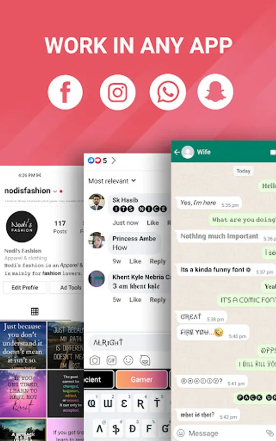 The ig fonts keyboard latest and stylish provides cool fonts for Instagram bio & stories. The keyboard font changer for android phone also allows you to write aesthetic Facebook posts, and decorate WhatsApp messages. Aa fonts keyboard app will make your social media profiles stand out with aesthetic fonts, gothic fonts, or serif fonts and cursive writing, but also allow you to send cool texts to your friends. Fonts fancy stylish keyboard works on Snapchat, Instagram, Facebook, Messenger, WhatsApp, Line, Twitter, TikTok, Discord, Telegram, and with all apps. You just need to make our fancy keyboard your default keyboard app.