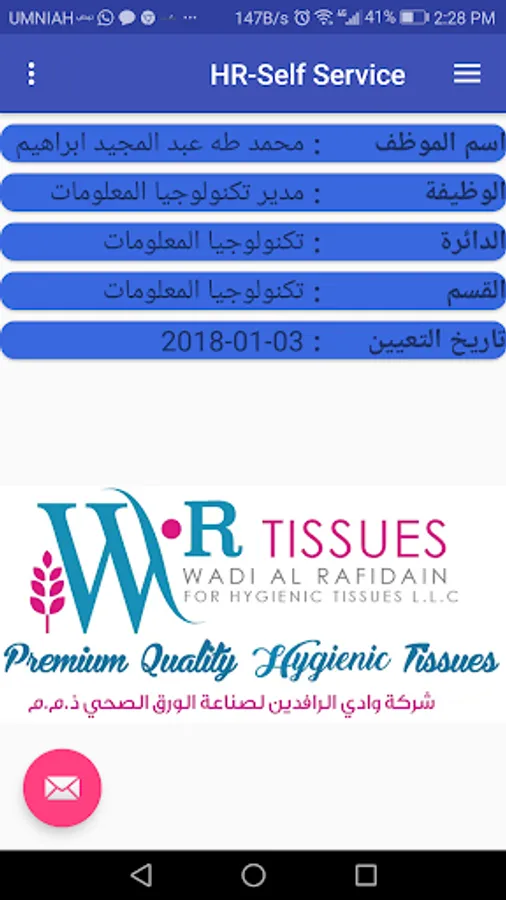 Application of self-service for the staff of Wadi Rafidain for Sanitary Paper