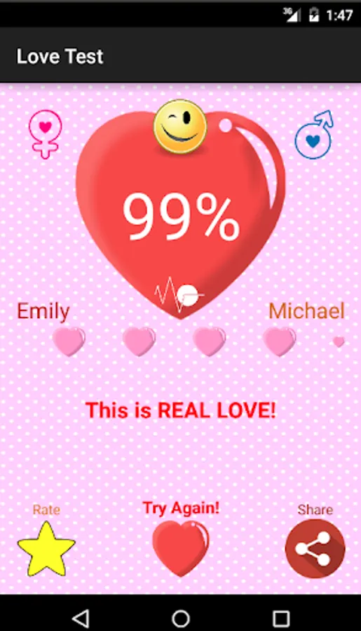 Test your love with the Love Test prank app! Please note this is a prank app and the results in the game are not real.