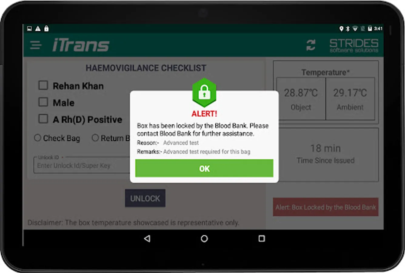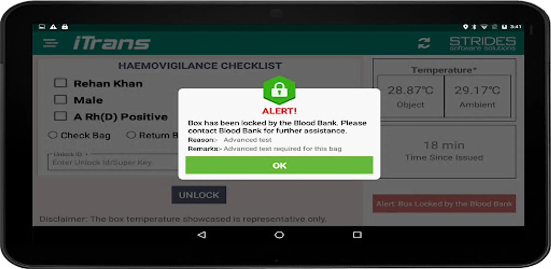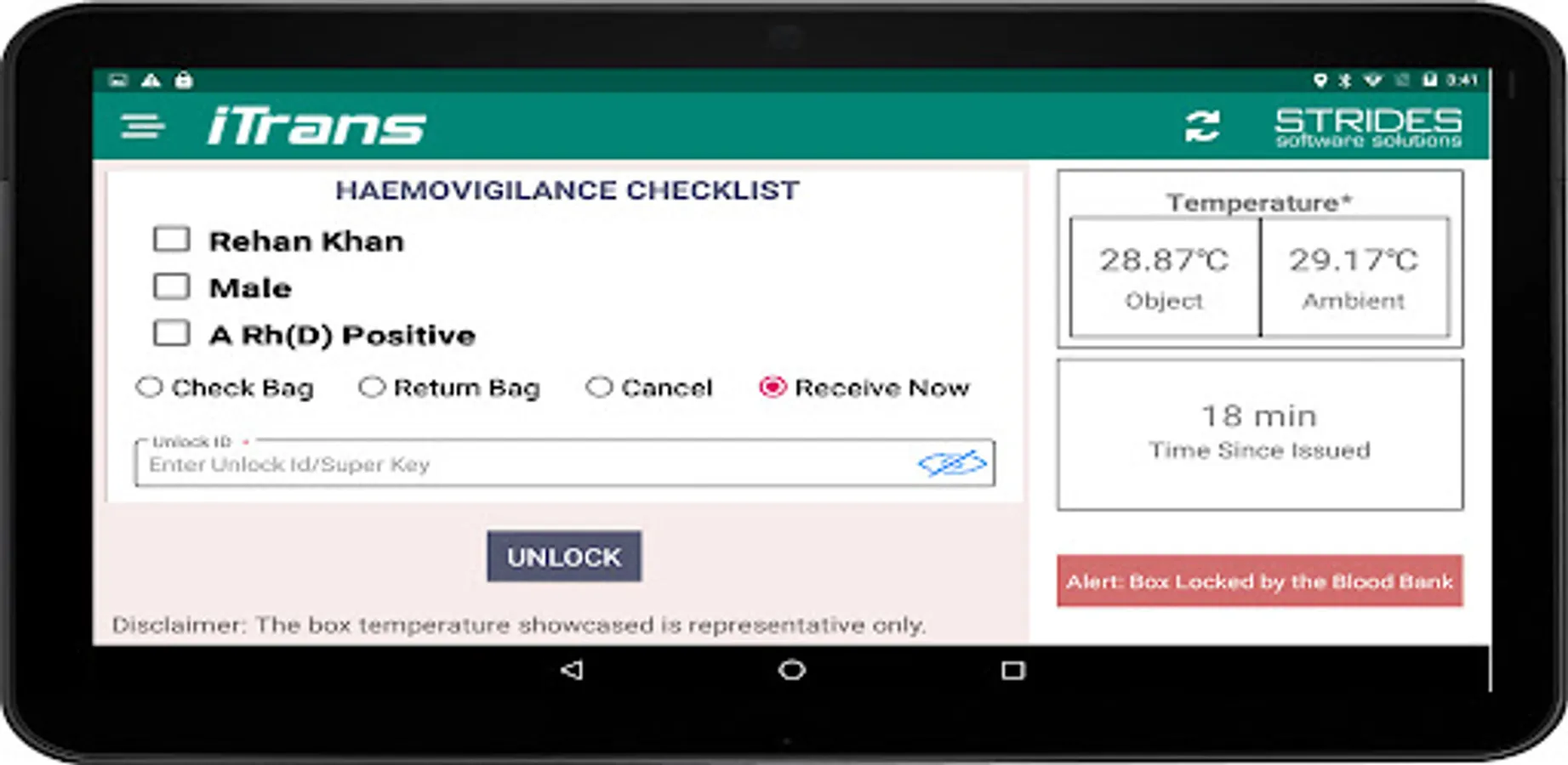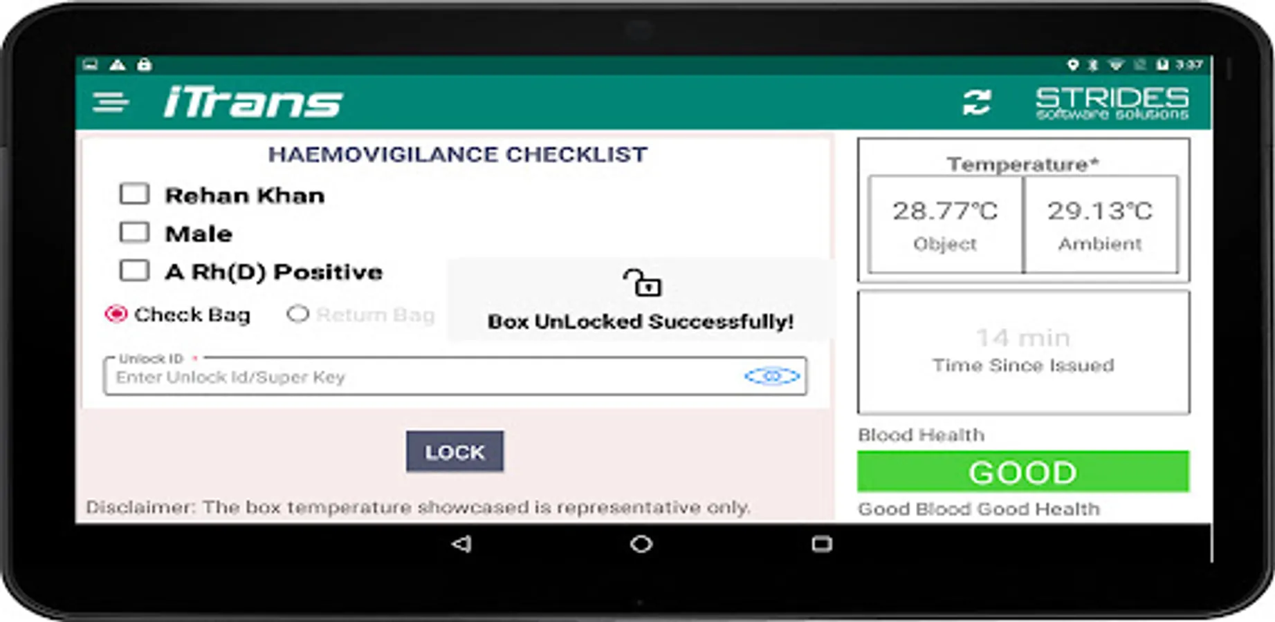 iTrans is a special box with an embedded circuit, lock and a touch screen display on the top. The Box has a software embedded onto it. iTrans works in both standalone mode as well as in software integrated mode. The blood transportation box auto locks as per the patient id for whom the bags are issued. At the patient bed side, the blood transportation box open only when the correct patient ID is entered on the box top touch screen. the blood transportation box allows remote locking by the blood banks in case of exceptions like reactive advanced test results, exceptions of temperature time etc.
