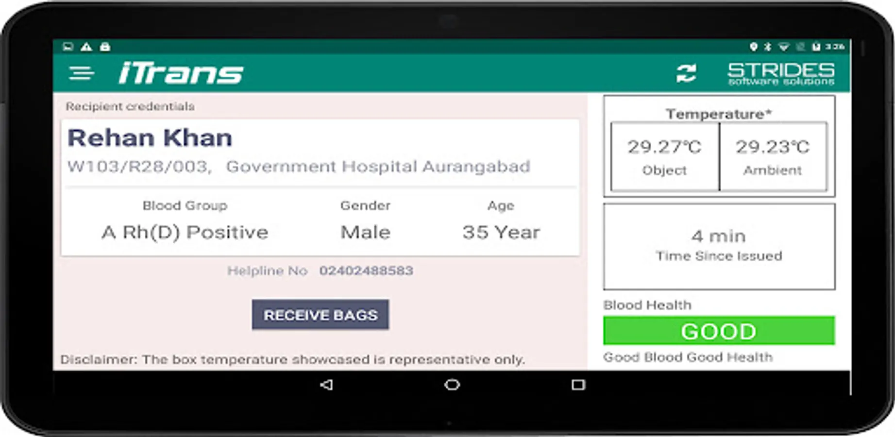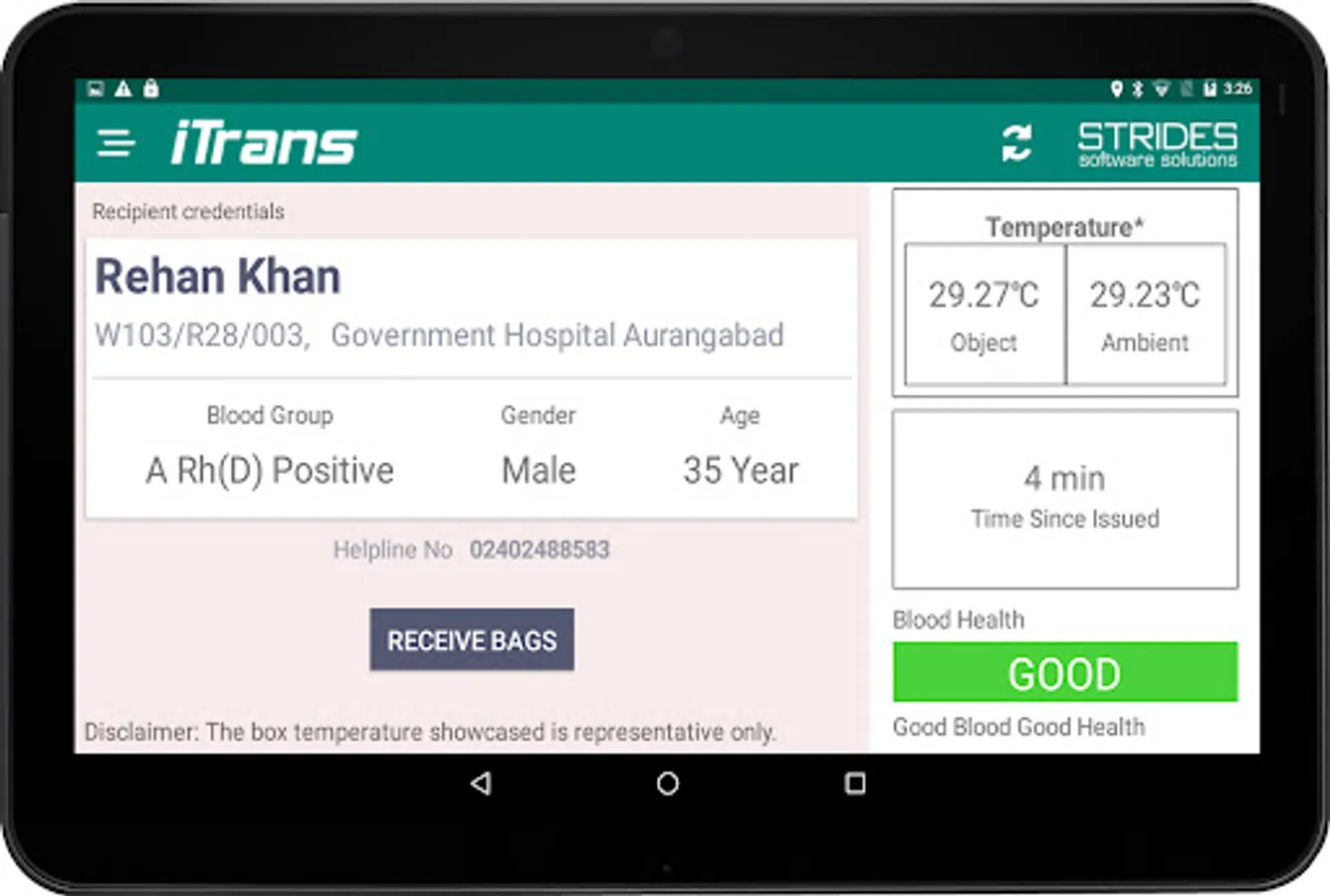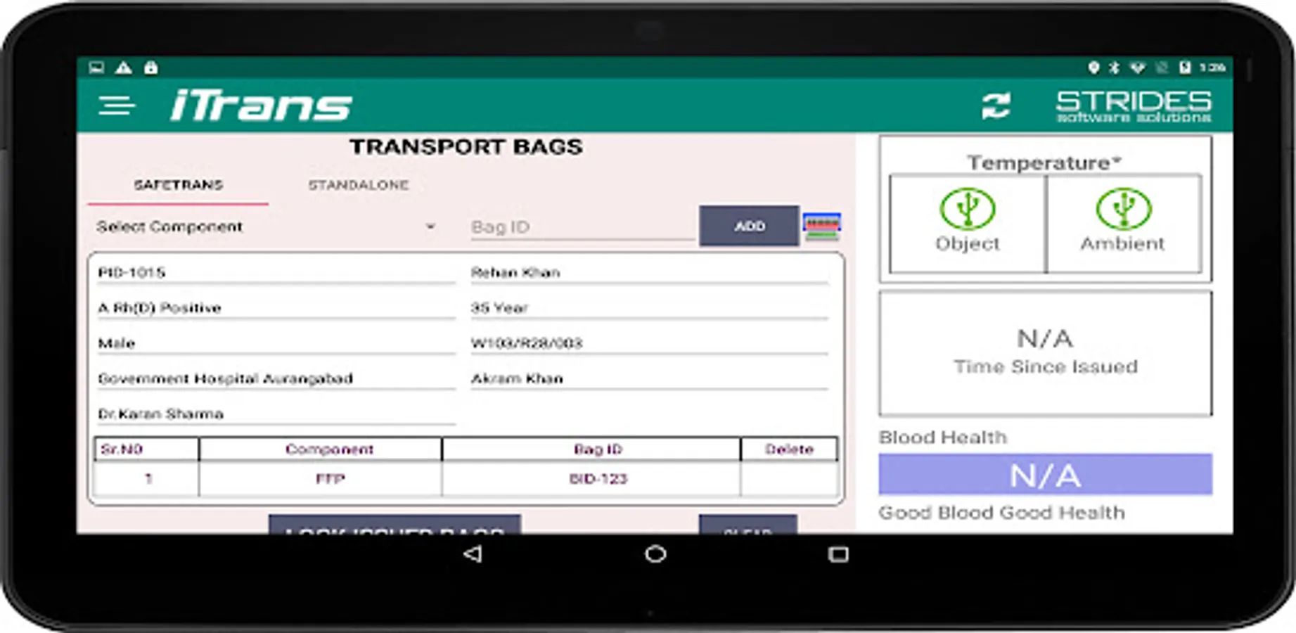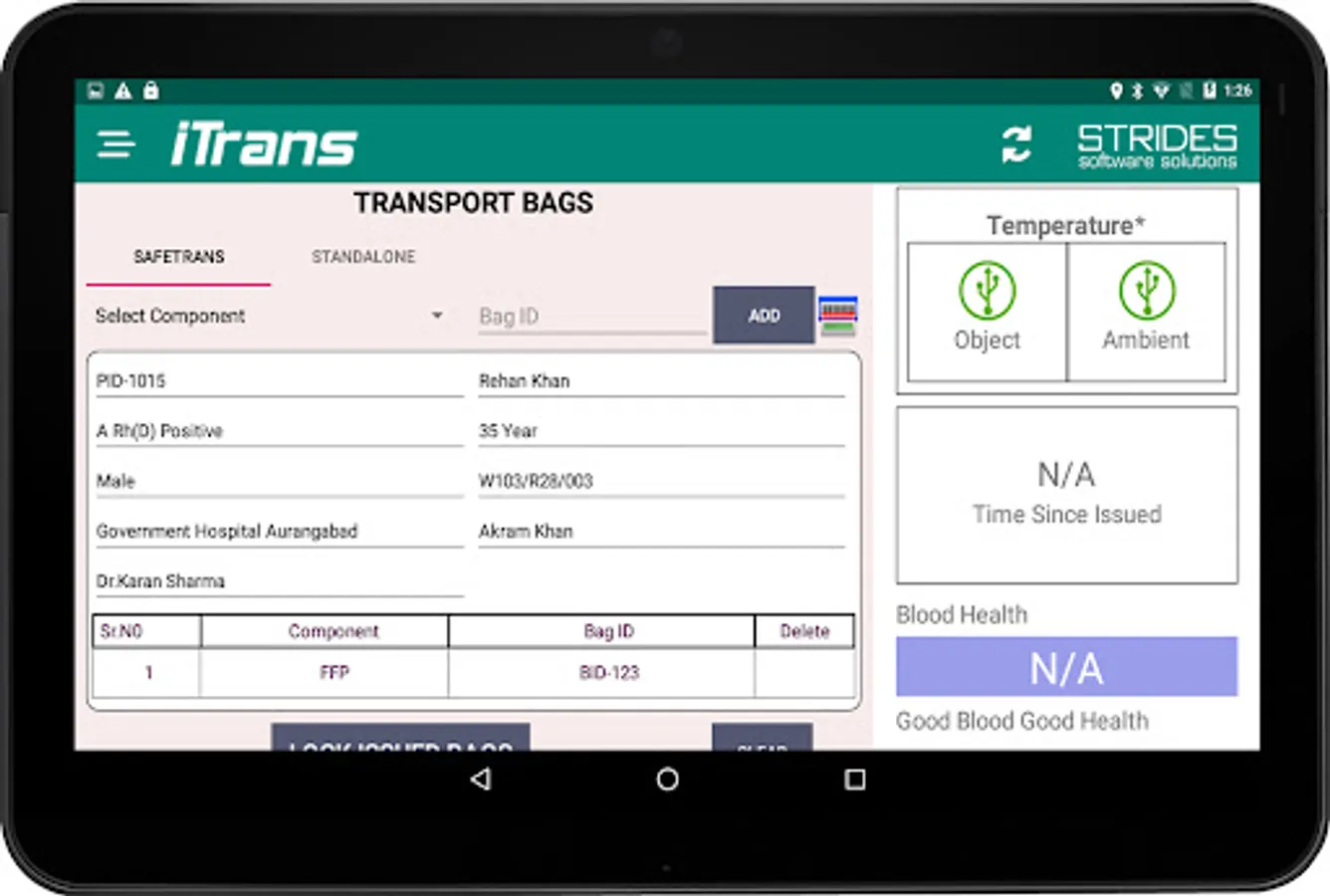 iTrans is a special box with an embedded circuit, lock and a touch screen display on the top. The Box has a software embedded onto it. iTrans works in both standalone mode as well as in software integrated mode. The blood transportation box auto locks as per the patient id for whom the bags are issued. At the patient bed side, the blood transportation box open only when the correct patient ID is entered on the box top touch screen. the blood transportation box allows remote locking by the blood banks in case of exceptions like reactive advanced test results, exceptions of temperature time etc.