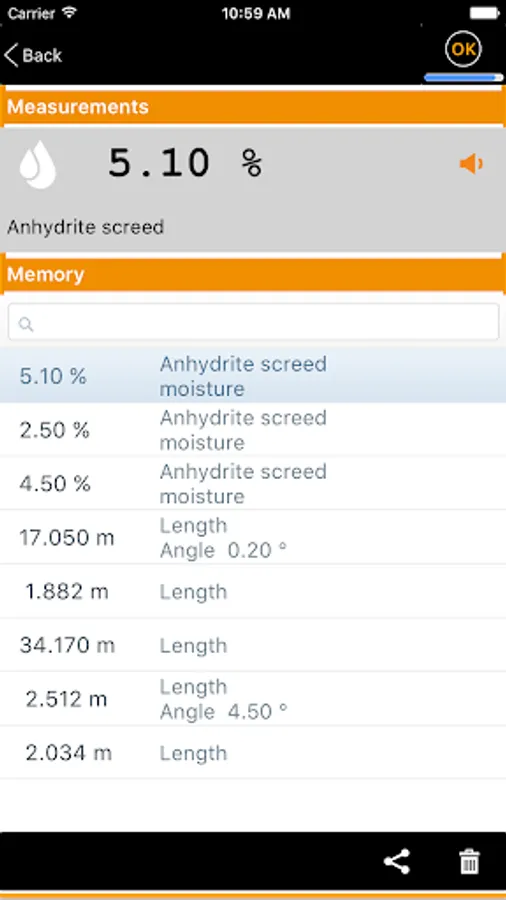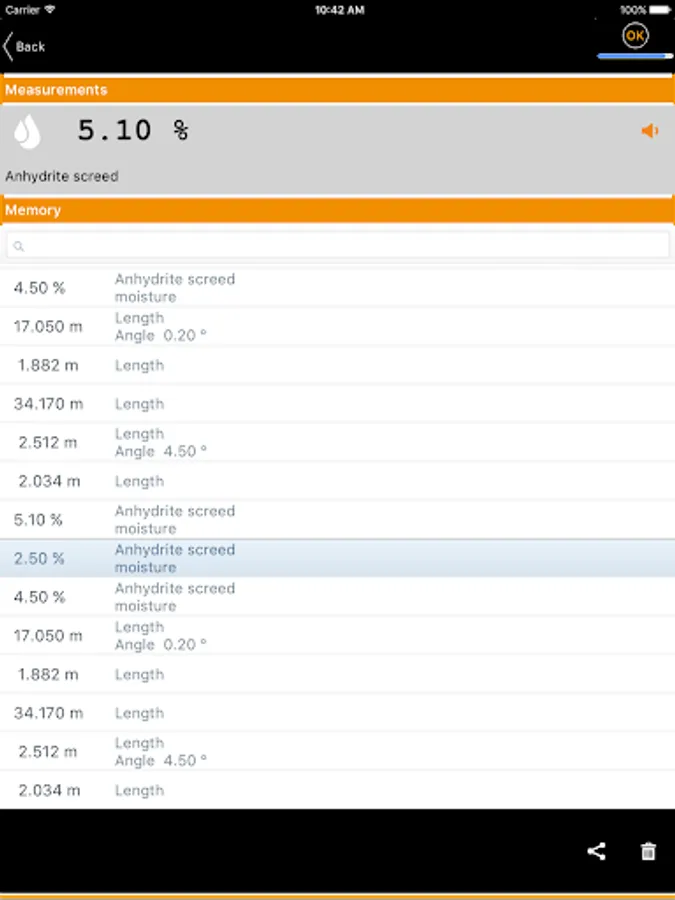 Measurements from moisture meter index can be selected and converted in realtime to desired construction materials, with improved material selection.