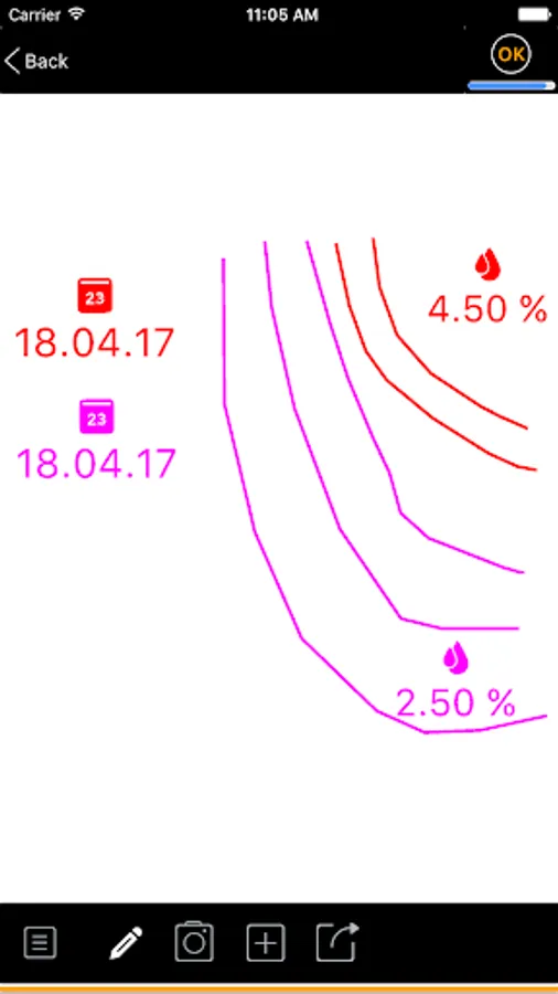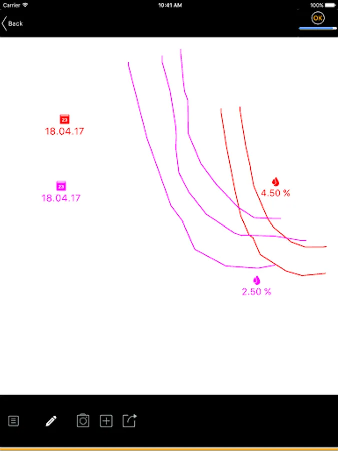The free-style drawing in images and photos with time stamp option is used to document and compare several measurements in a single picture.
