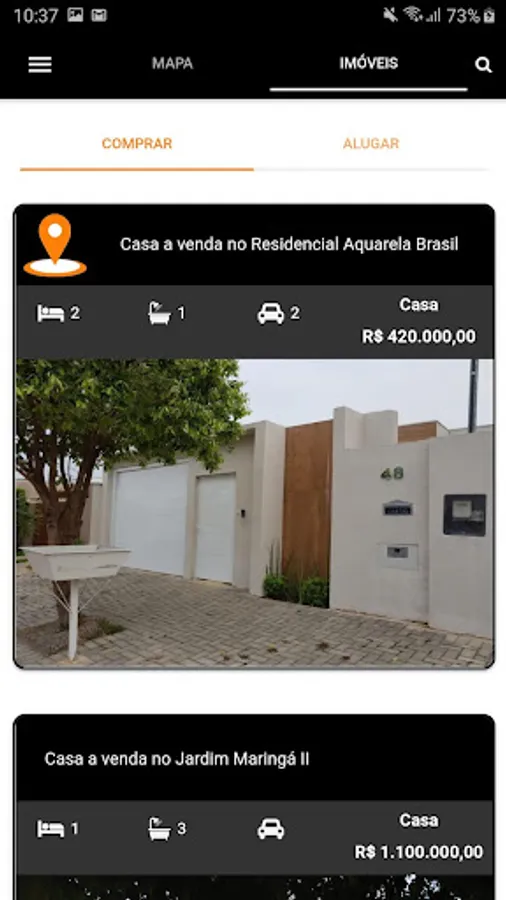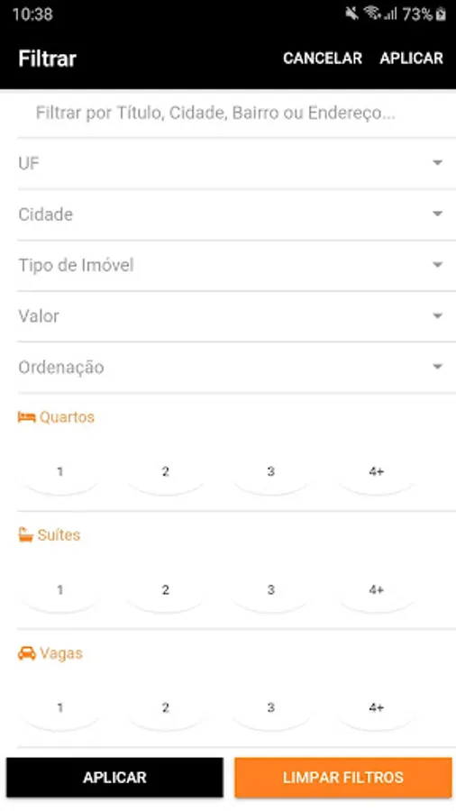 - Search filter by address, neighborhood, city, type of property, value range, number of rooms, suites and parking spaces;