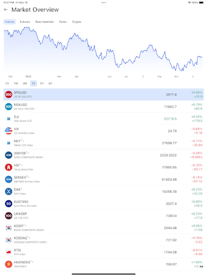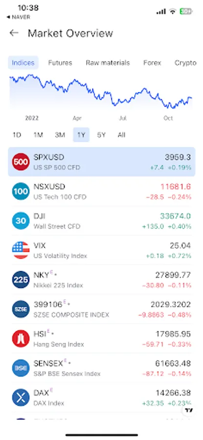 • App provides information on major indexes, futures, raw materials, and foreign exchange along with mini charts.