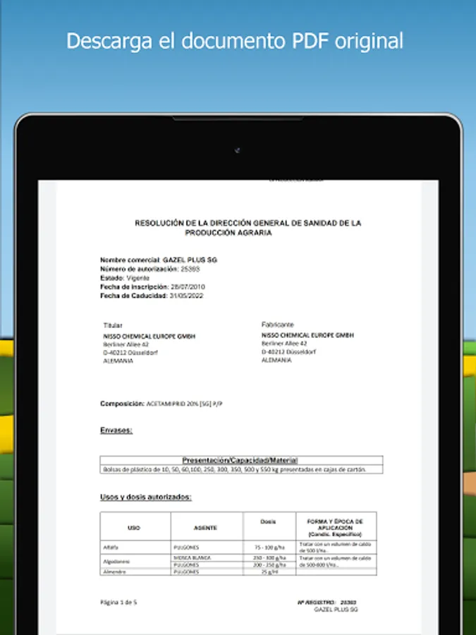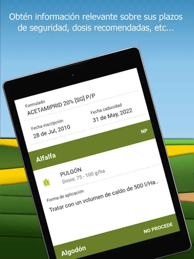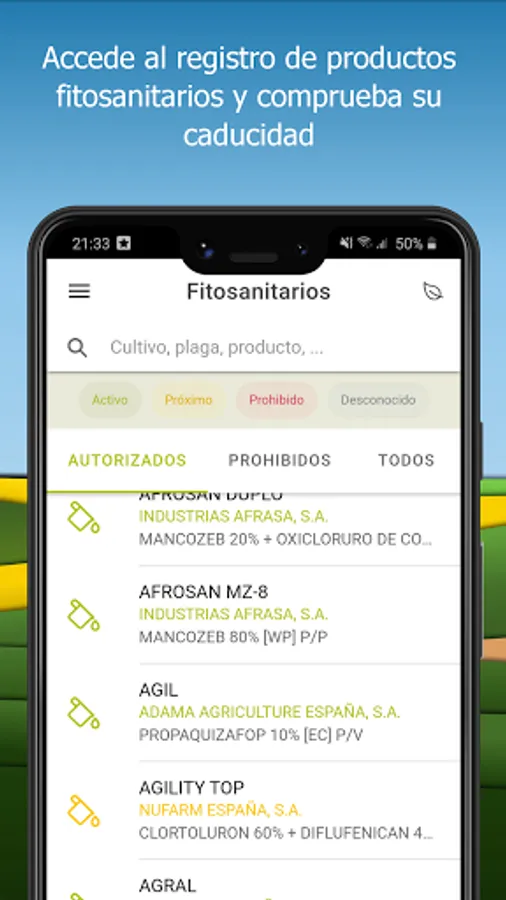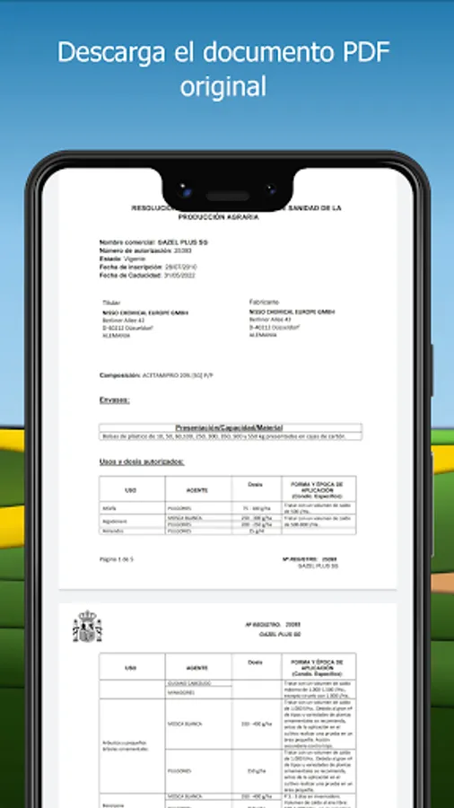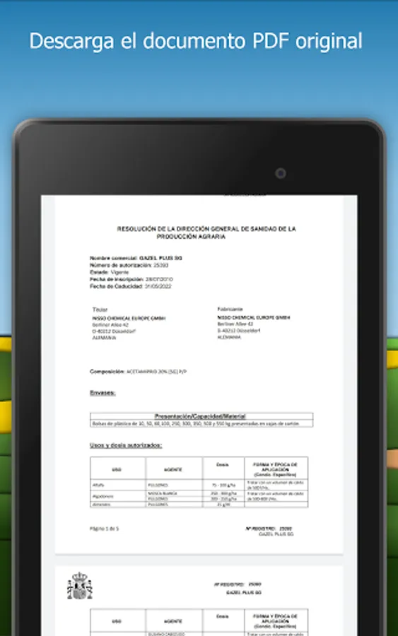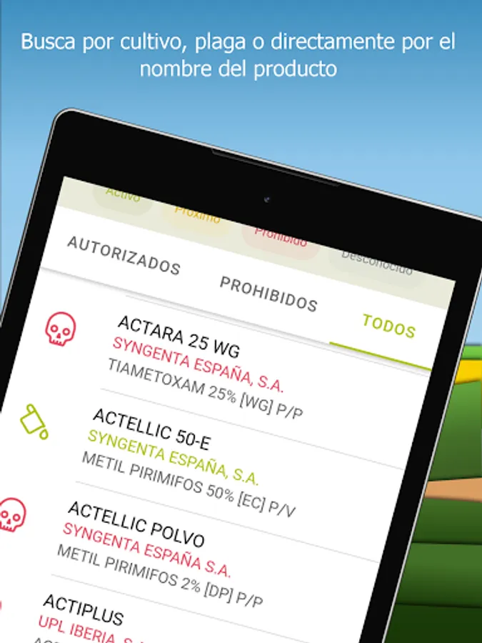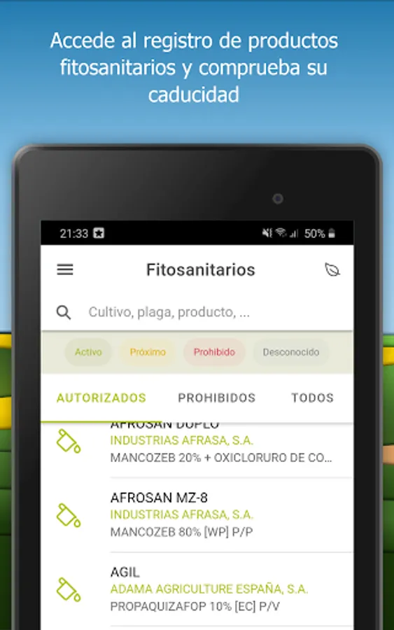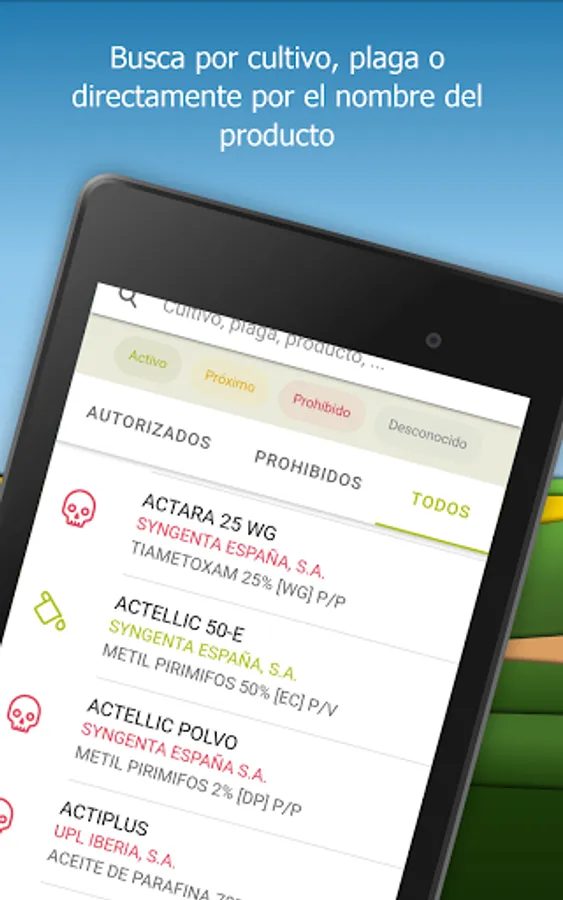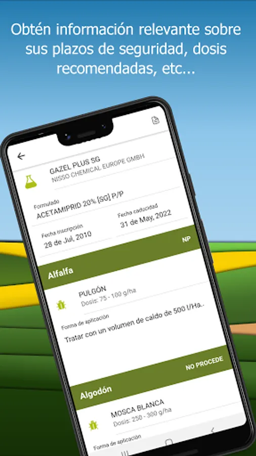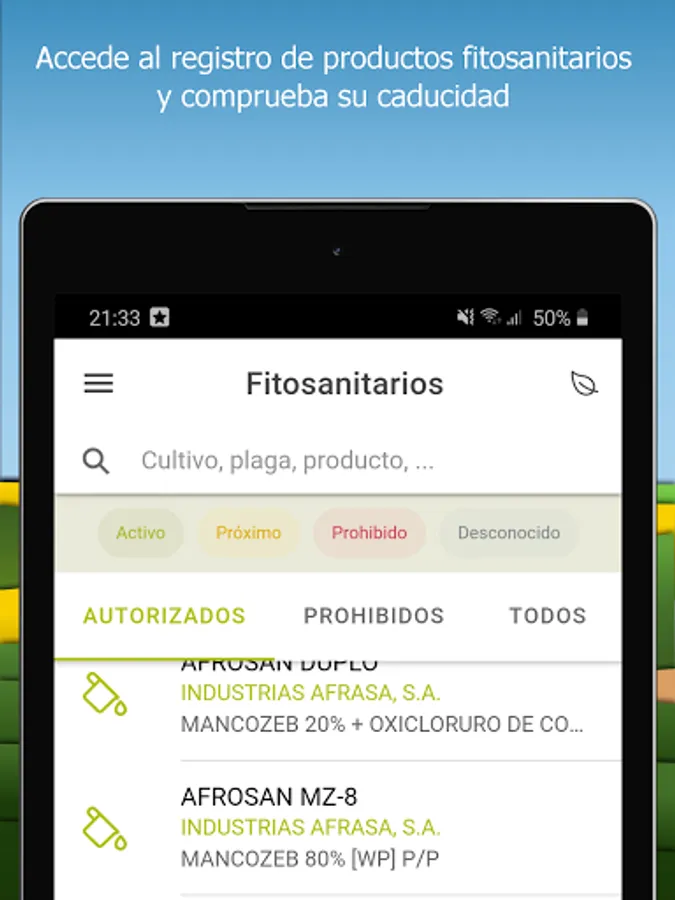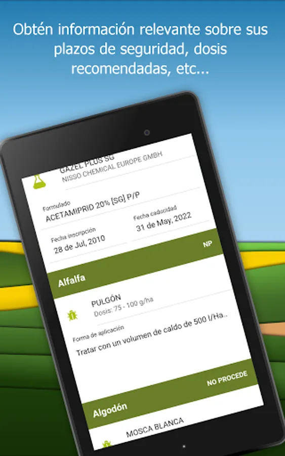 Through this application, you can check the availability of any phytosanitary product (recommended doses, pests, safety terms, etc ...) published by the Ministry of Agriculture, Fisheries and Food.