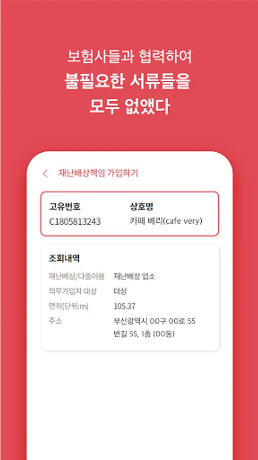 - 건물 혹은 사업장에 꼭 필요한 보험(재난배상, 승강기, 다중이용시설)을 앱하나로 가입할 수 있습니다.