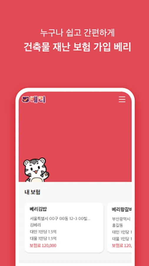 베리는 건축물 재난 보험 스마트 간편 가입 서비스입니다. 건물, 상가, 아파트 등의 대형보험을 쉽고 간편하게 가입할 수 있는 보험 앱입니다.