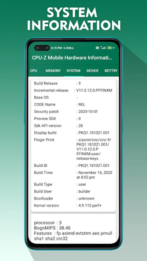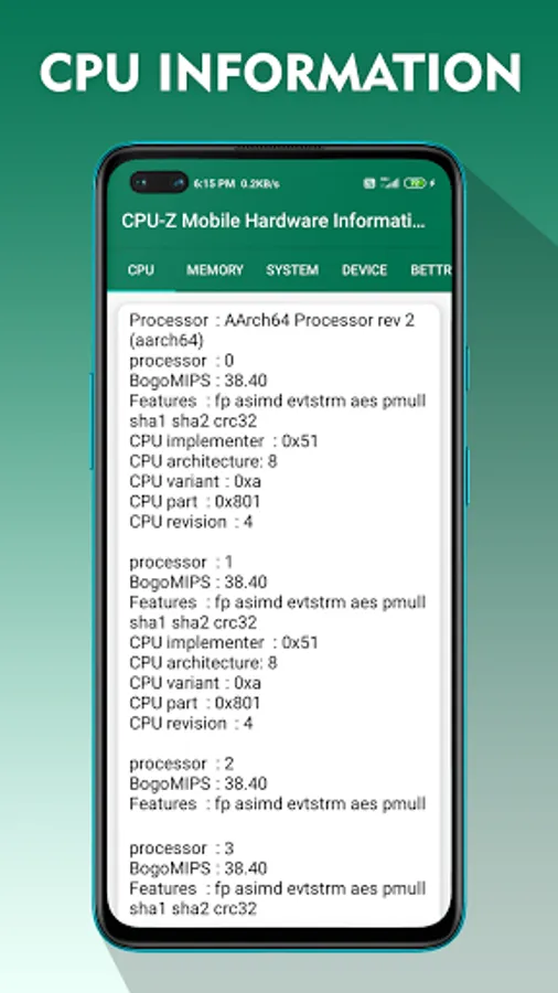 It is a CPU-Z Mobile System & Hardware info identification tool for android phone is one platform to know your any complete Android version information about your phone of CPU in one click, and user can see Sensor, Battery, Device, System and many more. it is a CPU z free application that reports information about your device.