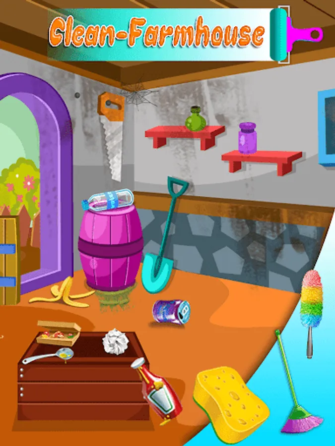 The bedroom is so messy, let’s help this little princess to clean up by dusting, mopping, arranging things like a pillow, alarm clock, piggy-bank, her toys, wiping walls and all the dirt.