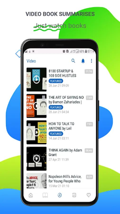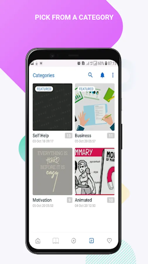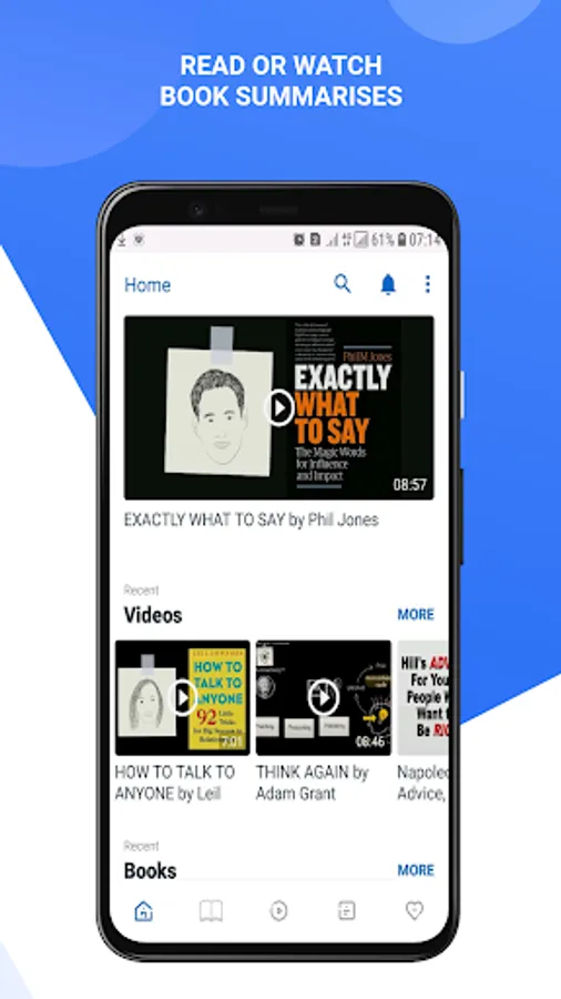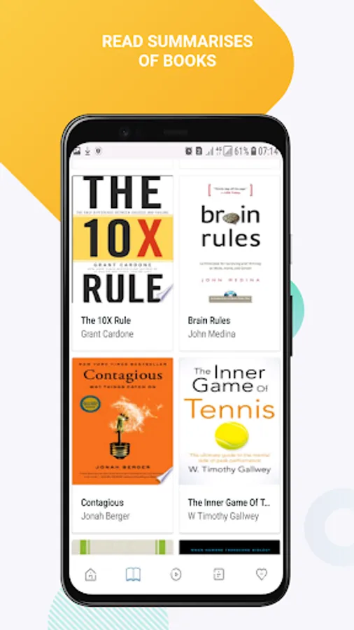 The app contains book summaries of business books, self-help books, marketing books, personal development books, carrier development books and other categories all summarized into key takeaways that can be read in 5 minutes or less.