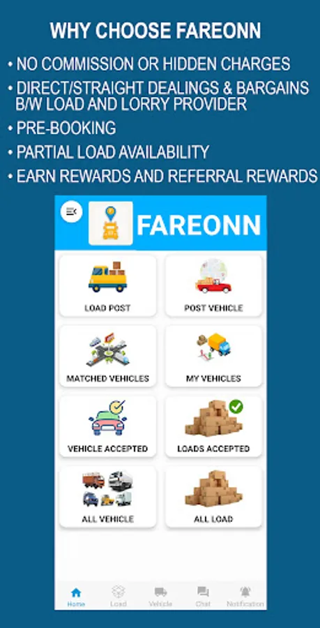 Fareonn is an app which is made exclusively for the Transport Industry. It is an online platform connecting transporters, truck drivers, truck/fleet owners, and consignors or Load owners. Fareonn aims to bridge the gap between customers and service providers by offering online vehicle booking solutions for handling bulk transport using technology. We endeavor to steer your business forward with speed and efficiency. We provide you a platform to input data (Load/Vehicle) as per your convenience so that you can get a suitable vehicle for your load at the right price. We make the process of movement of your goods smooth and efficient without any service charges.