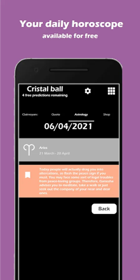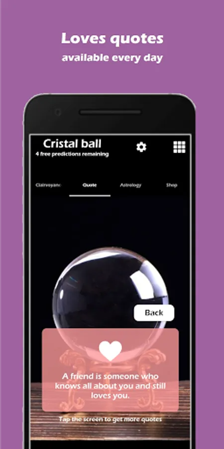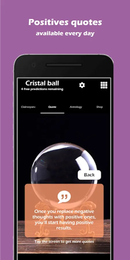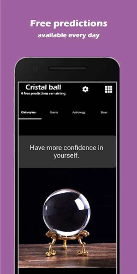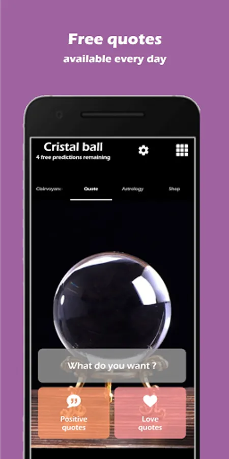 Download our free fortune-telling crystal ball app now and embark on a journey of self-discovery and spiritual wisdom. Get predictions, explore your horoscope, and nourish your mind with inspiring quotes. Your future is in your hands - seize this opportunity today!