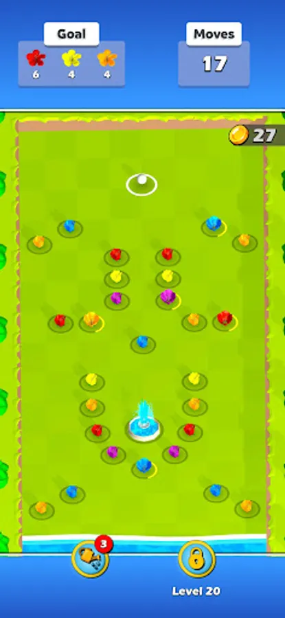But the garden is full of surprises. Beware of the fountains! When a water droplet reaches a fountain, it showers all surrounding flowers with a refreshing splash. It's a cascade of colors and points every time!