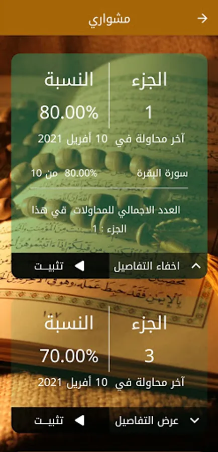 The application helps you memorize and test for the benefit of students of the Holy Quran to review the Holy Quran and fix the ends of the verses through multiple-answer questions, arranged according to the parts and the walls of the Holy Quran. as such