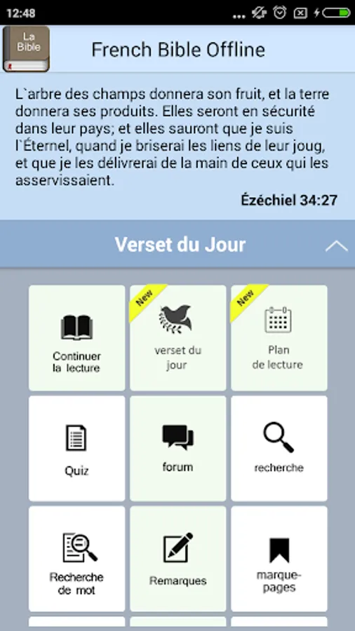 We are proud and happy to release the Holy Bible (La Bible) Offline in French in android for free. No internet connection is required to use this app.This app contains both "Old Testament" and "New Testament". Search option is also provided for quick reference. Forum has been included to have spiritual discussions.