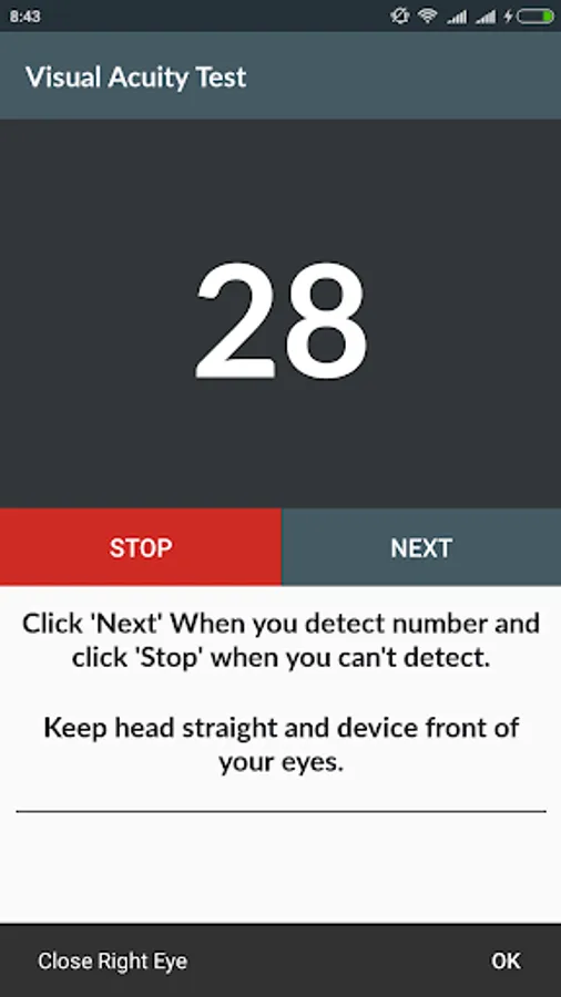 Click 'right' for test of right eye-close left eye.