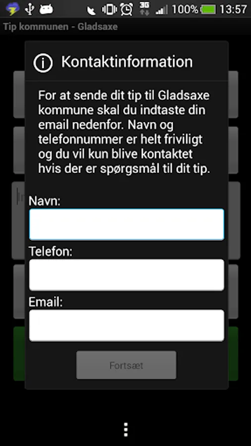 If you choose to give personal information and send them with your tip, you agree that this data is stored by Soft Design A / S and shared with the municipality of Gladsaxe which your tip sent.